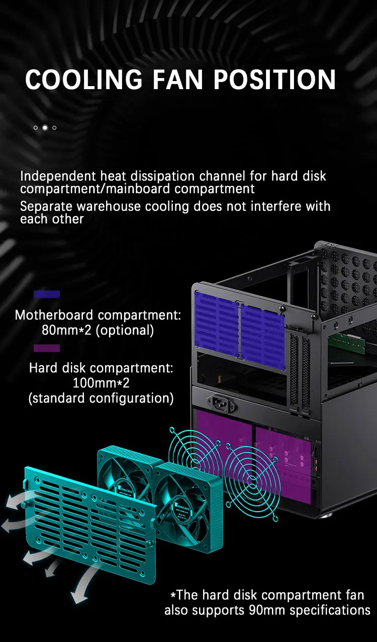 Sistema de refrigeración: compartimento del disco duro 100*25mm * 2 (configuración estándar), compartimento de la placa base 80*25mm * 2 (opcional)