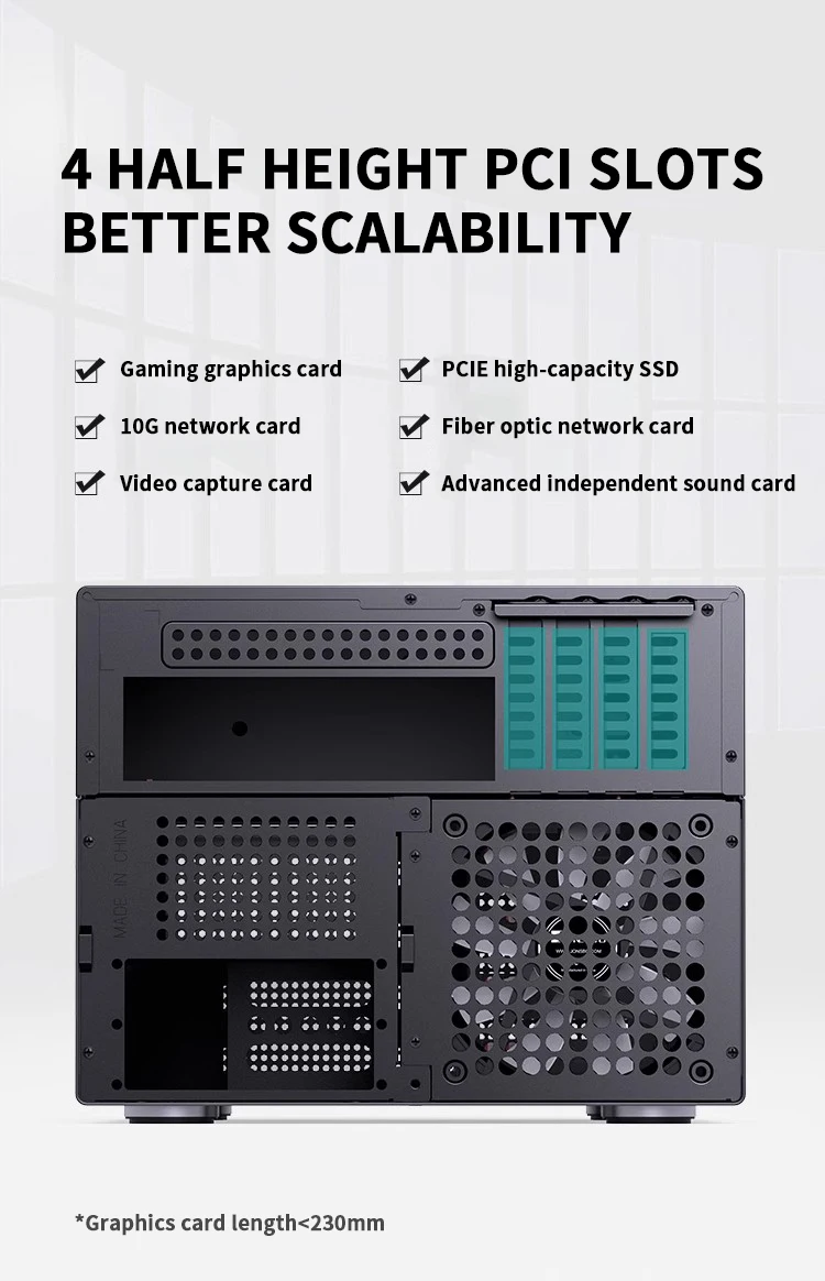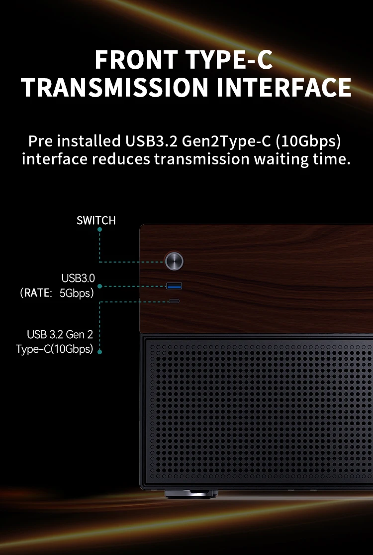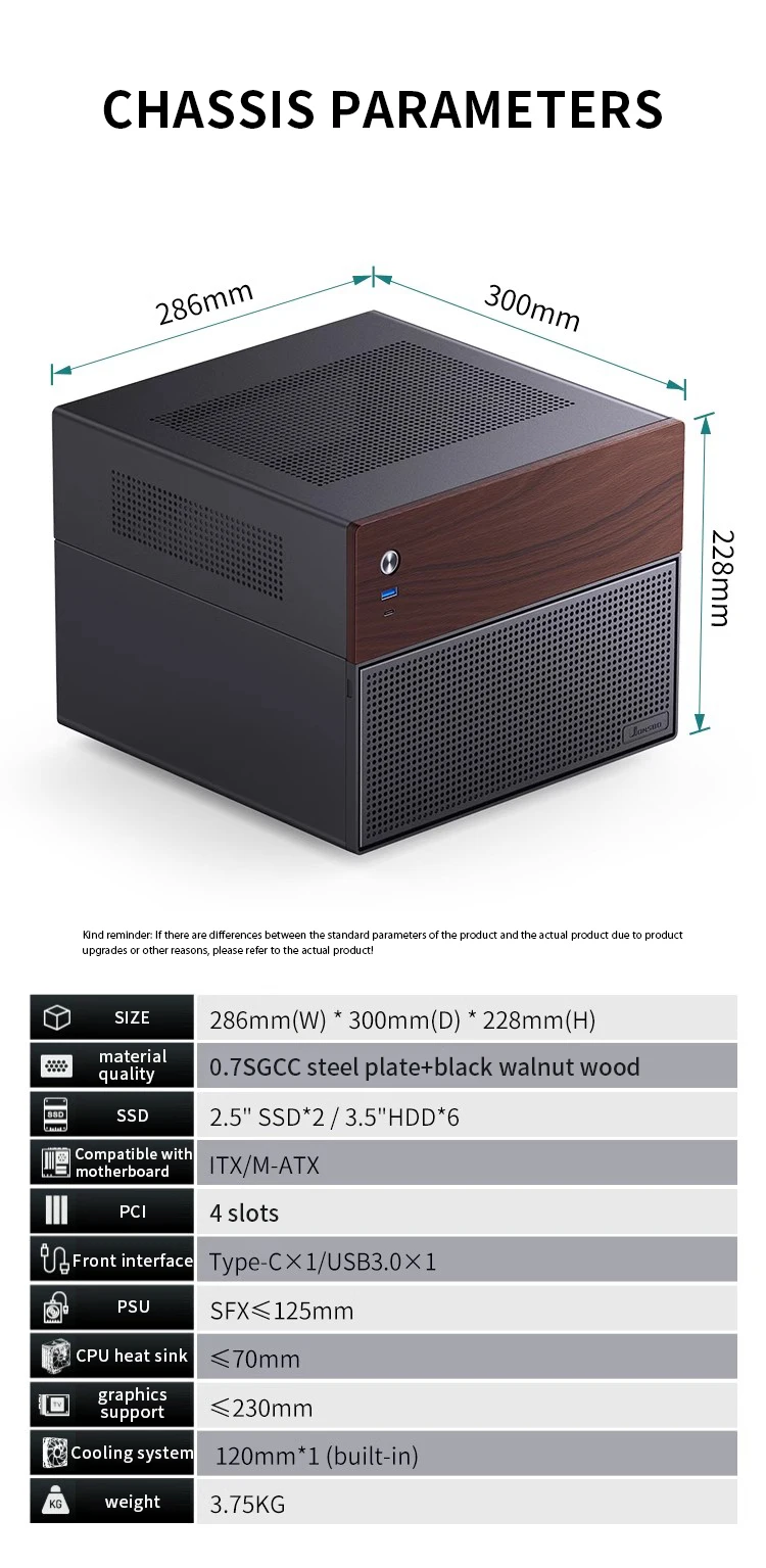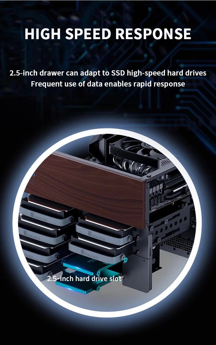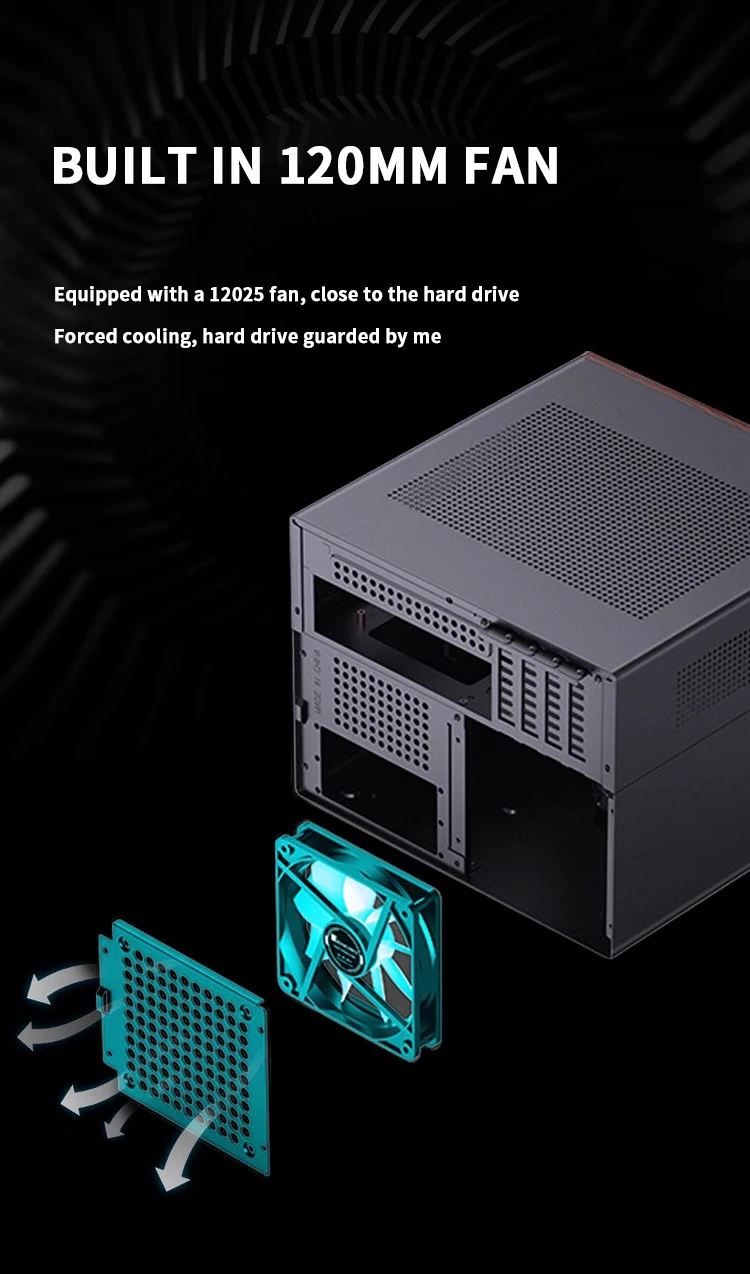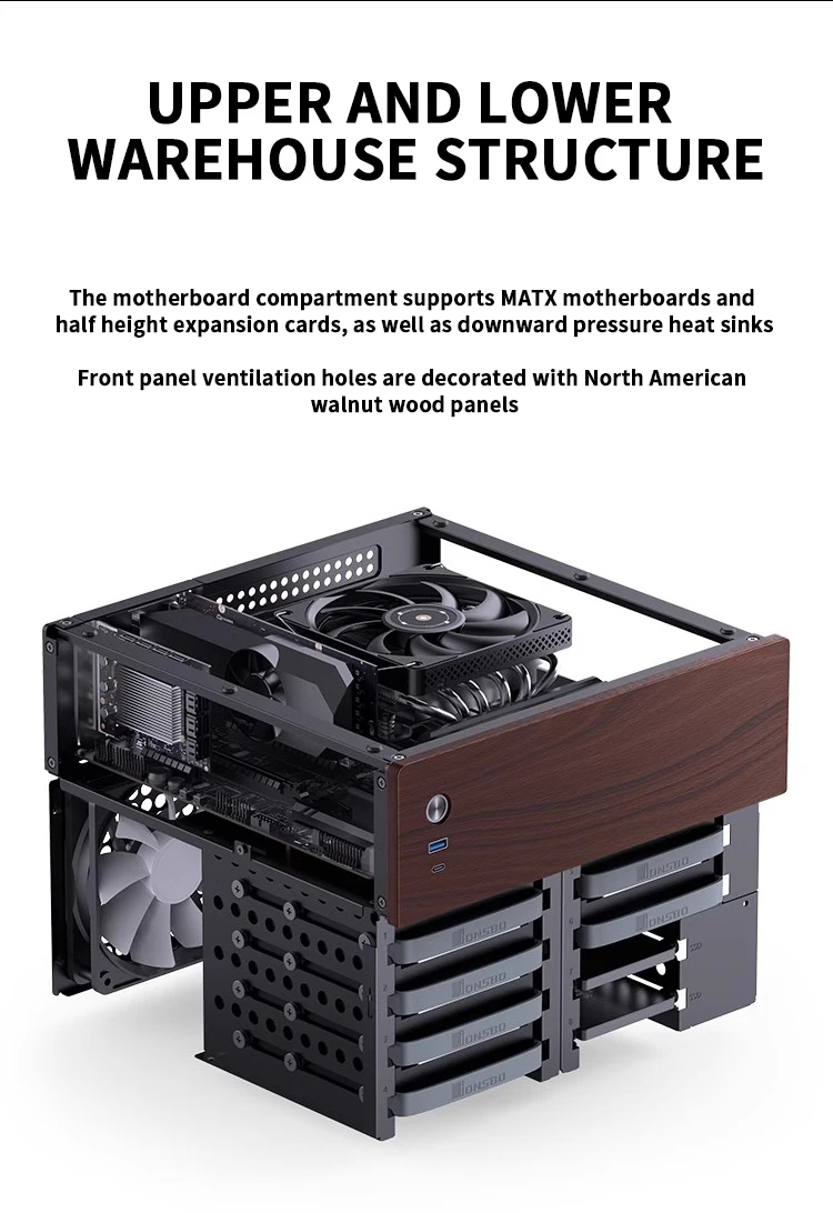 JONSBO N4 Negro NAS Chasis M-ATX Placa base SFX Ranura de alimentación 6 Grandes 2 Ranuras para disco duro pequeñas 120mmx1Panel decorativo de nogal con ventilador