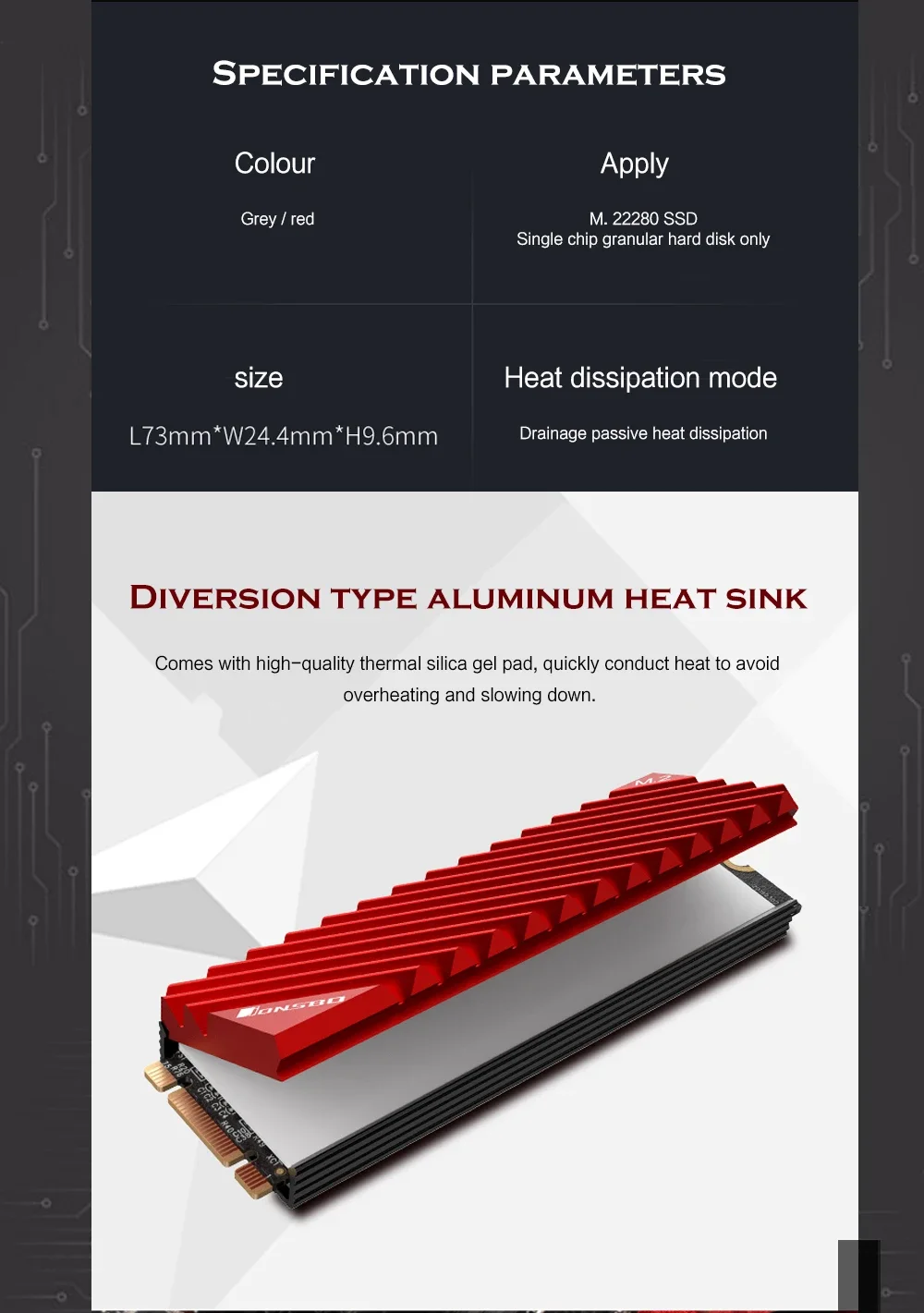 JONSBO SSD NVME Disco Duro Radiador de Aluminio Sólido 2280 Chaleco Conductor Térmico, M2 Disipador de Calor NGFF, Gris/Rojo,