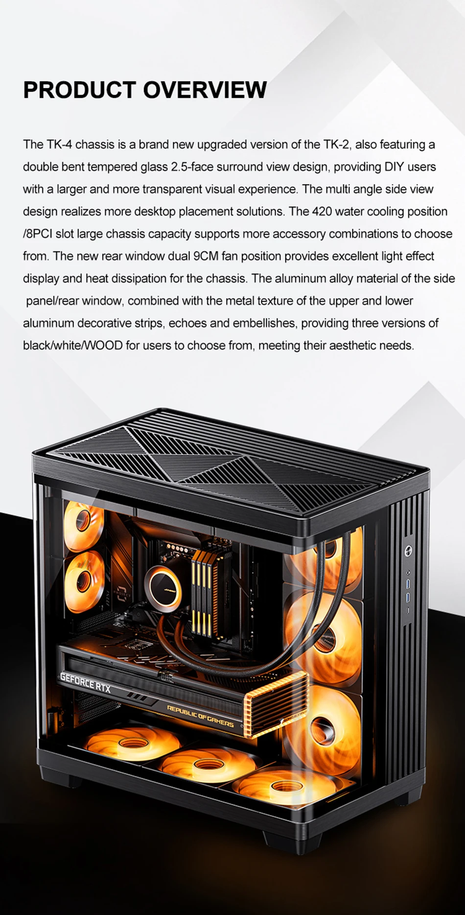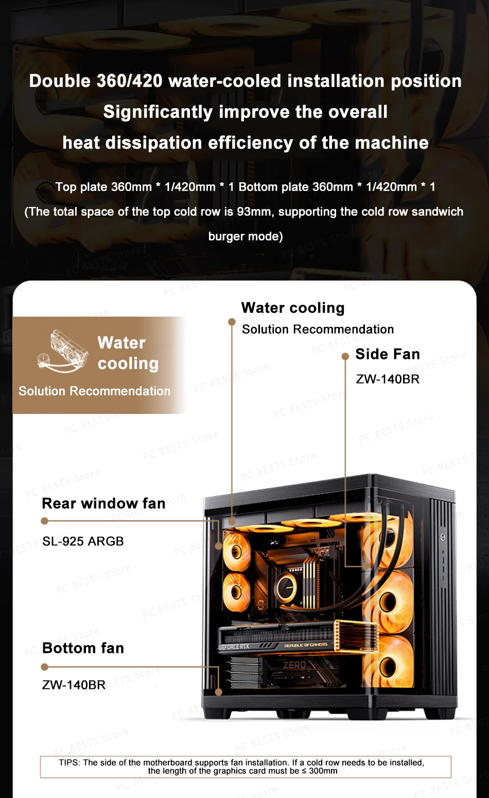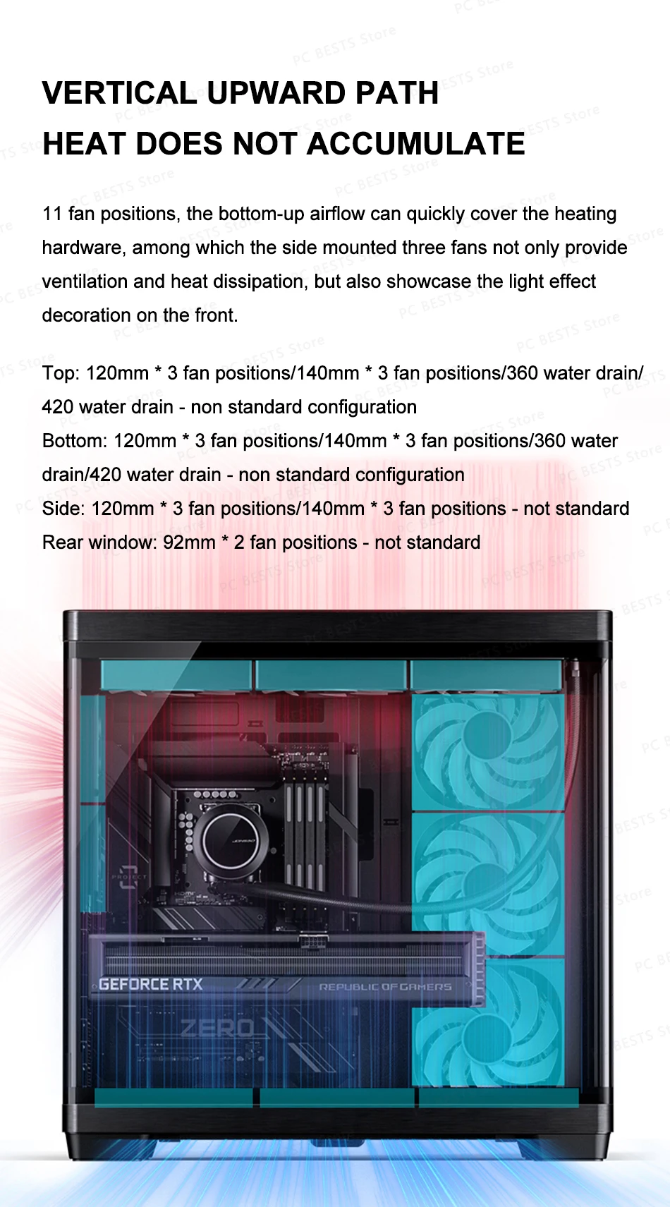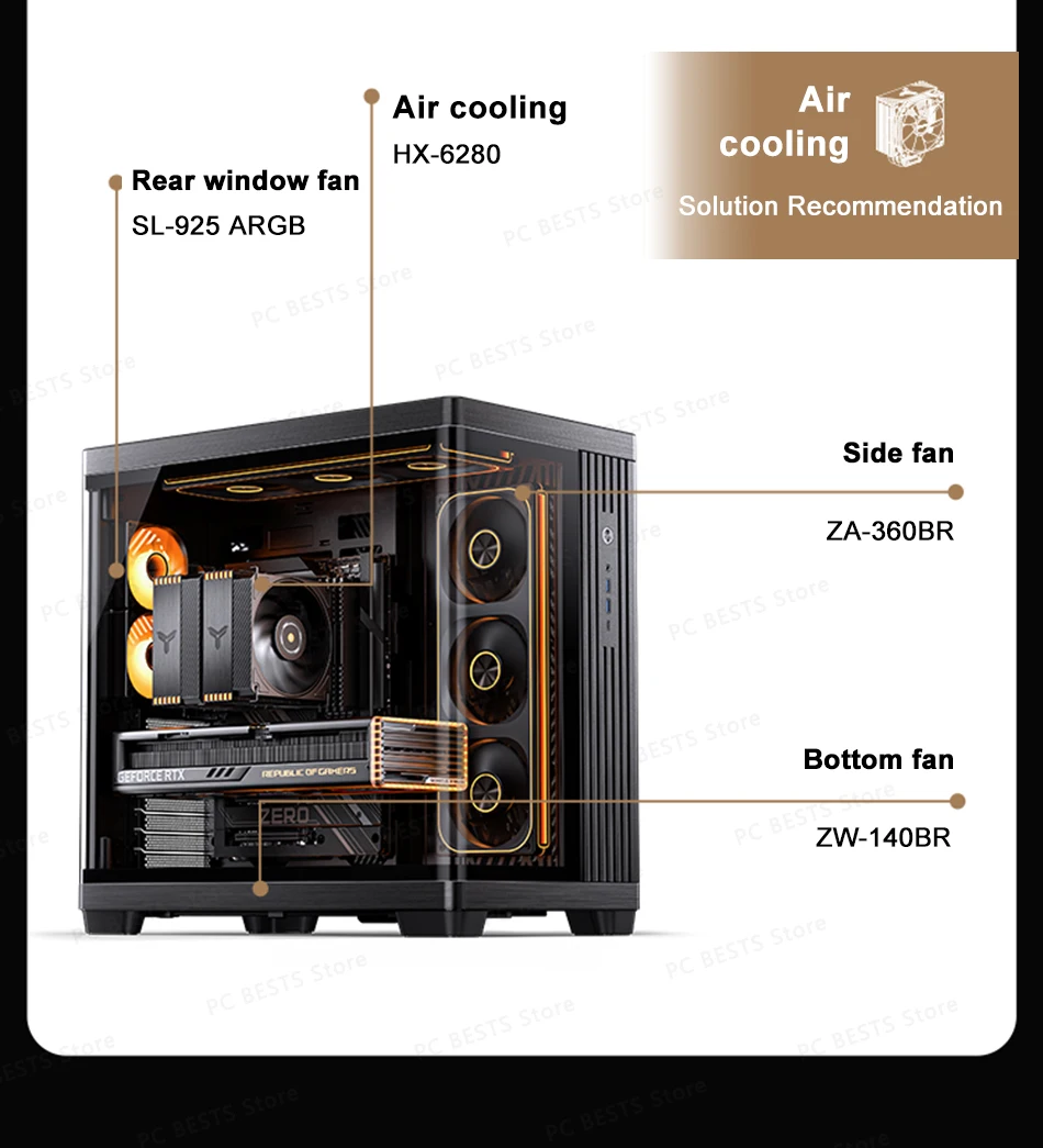Ventilador: Parte superior: 120 mm * 3/140 mm * 3 (no estándar); Parte inferior: 120 mm * 3/140 mm * 3 (no estándar) Derecha: 120 mm * 3/140 mm * 3 (no estándar) Tablero de fondo: 92 mm * 2 (no estándar)