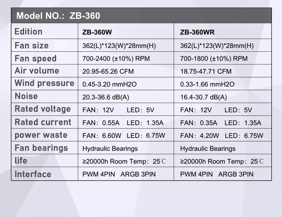 Tamaño del ventilador: 362 mm (largo) * 123 mm (ancho) * 28 mm (alto)