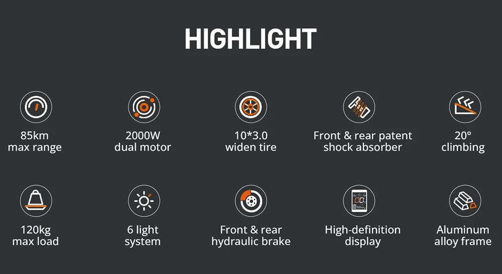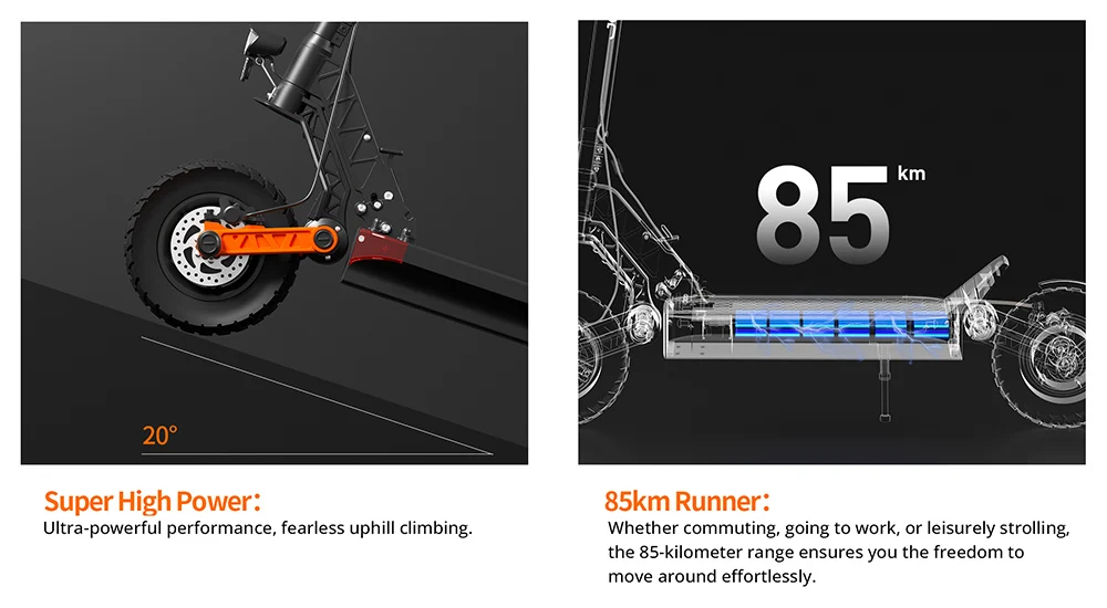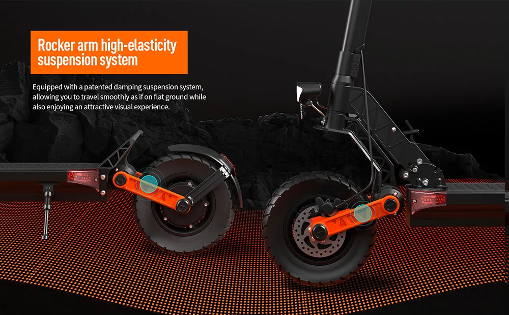 Los grandes neumáticos delanteros y traseros de 10 pulgadas tienen una gran absorción de impactos y bandas de rodadura antideslizantes. Junto con un motor de CC sin escobillas de 2*1000W para una salida de potencia estable, el S10-s está configurado para ofrecer una experiencia de conducción más suave.