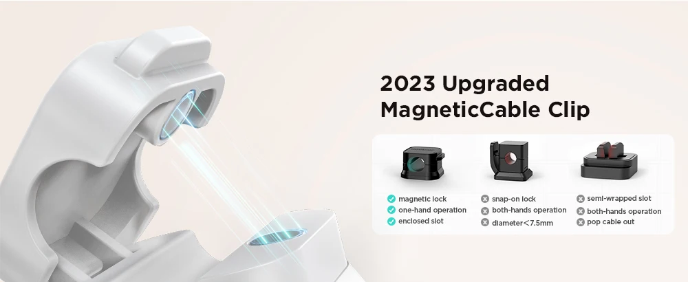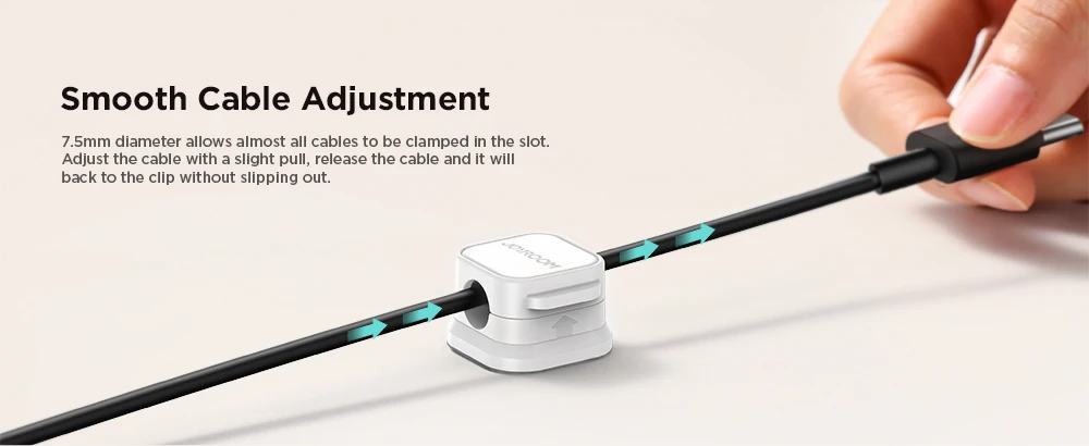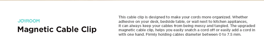 2. 【Diseño de abrazadera magnética】 El exclusivo diseño de clip de cable de apertura y cierre magnético le permite colocar y quitar cables con una sola mano.A diferencia de otros sujetacables en el mercado, el organizador de cables Joyroom utiliza un sofisticado 60° Diseño de eje giratorio y cable de bloqueo magnético, que le ayuda a quitar fácilmente un cable o agregar un cable fácilmente.