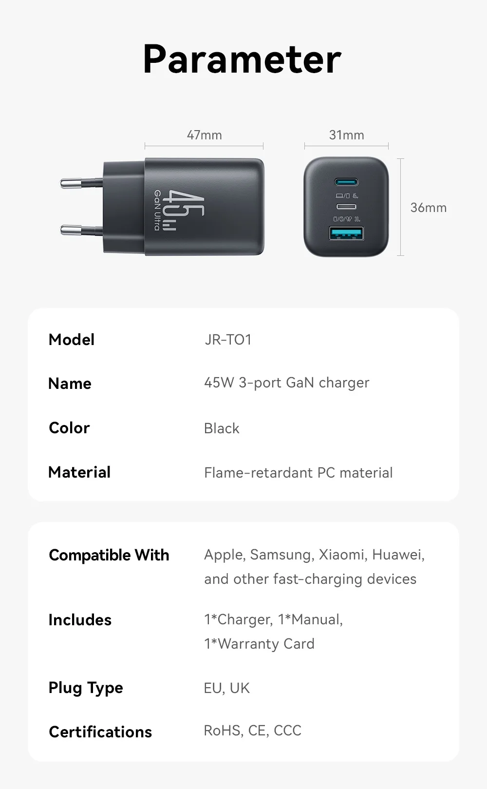 Cargador Súper Rápido... Compatible con múltiples protocolos de carga de hasta 45W... Honor... Xiaomi... OnePlus SuperVooc 30W-45W y mucho más... Ligero y compacto... Diseño excepcional y calidad superior... JoyRoom One, el mejor... Cinco 🌟🌟🌟🌟🌟