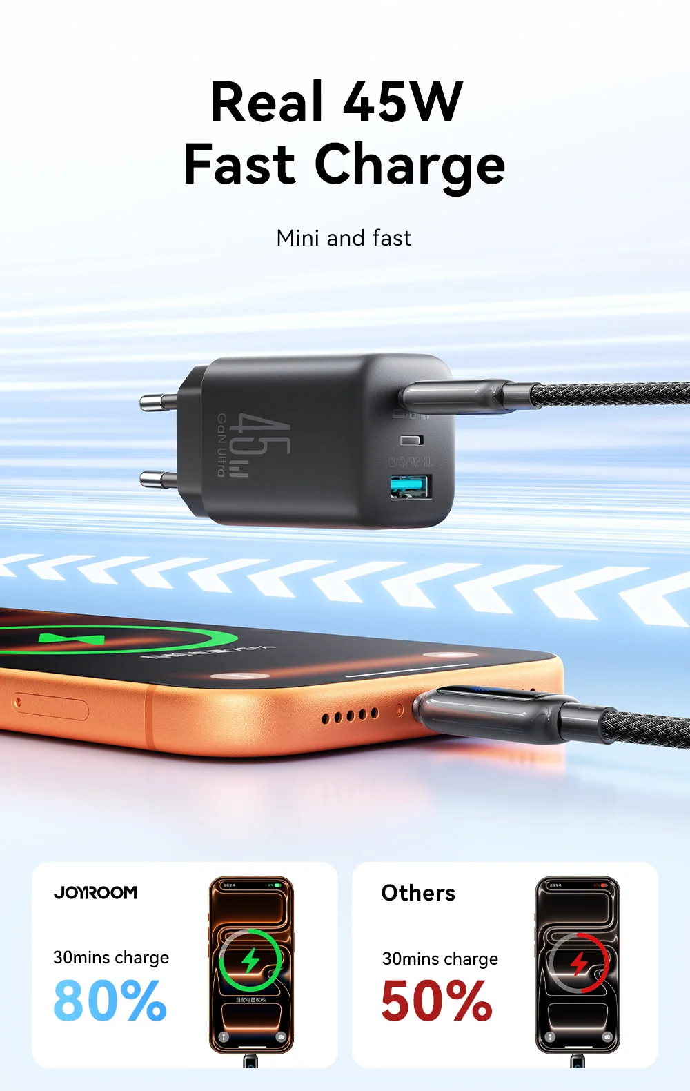 Cargador Súper Rápido... Compatible con múltiples protocolos de carga de hasta 45W... Honor... Xiaomi... OnePlus SuperVooc 30W-45W y mucho más... Ligero y compacto... Diseño excepcional y calidad superior... JoyRoom One, el mejor... Cinco 🌟🌟🌟🌟🌟