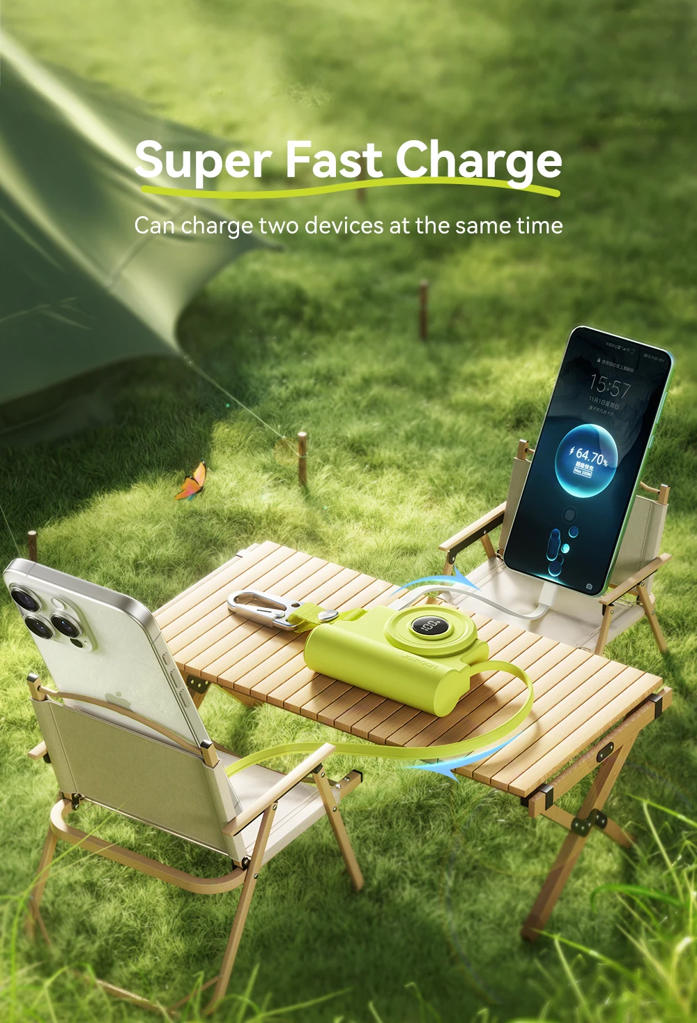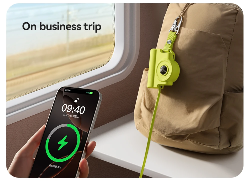 1.Viene con un cable retráctil, un tirón para cargar, tire de nuevo para rebotar y guárdelo dentro del banco de energía móvil