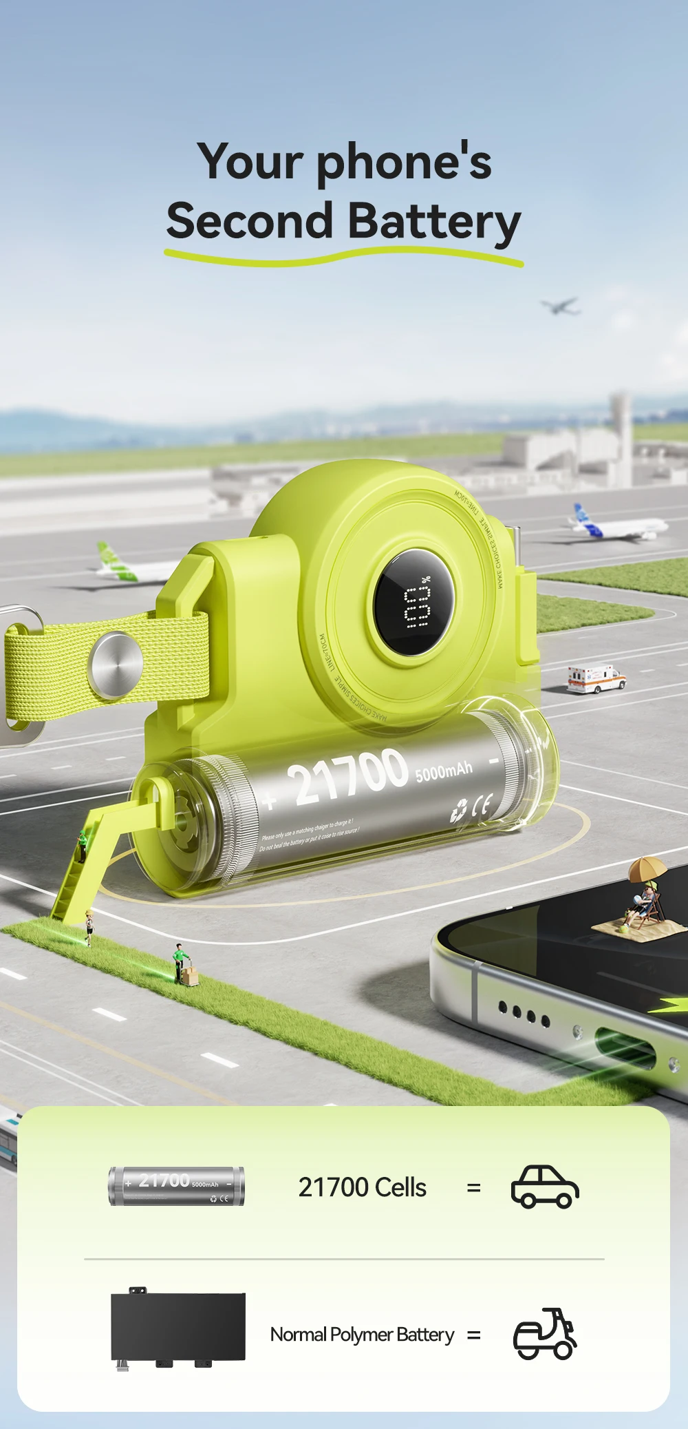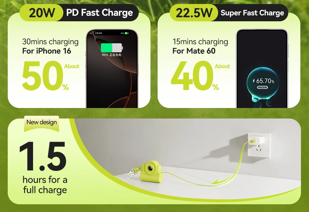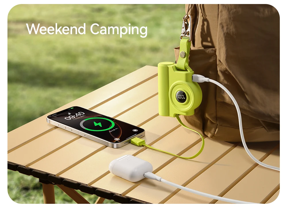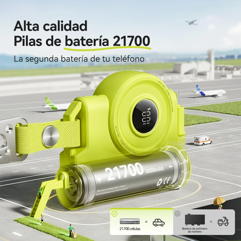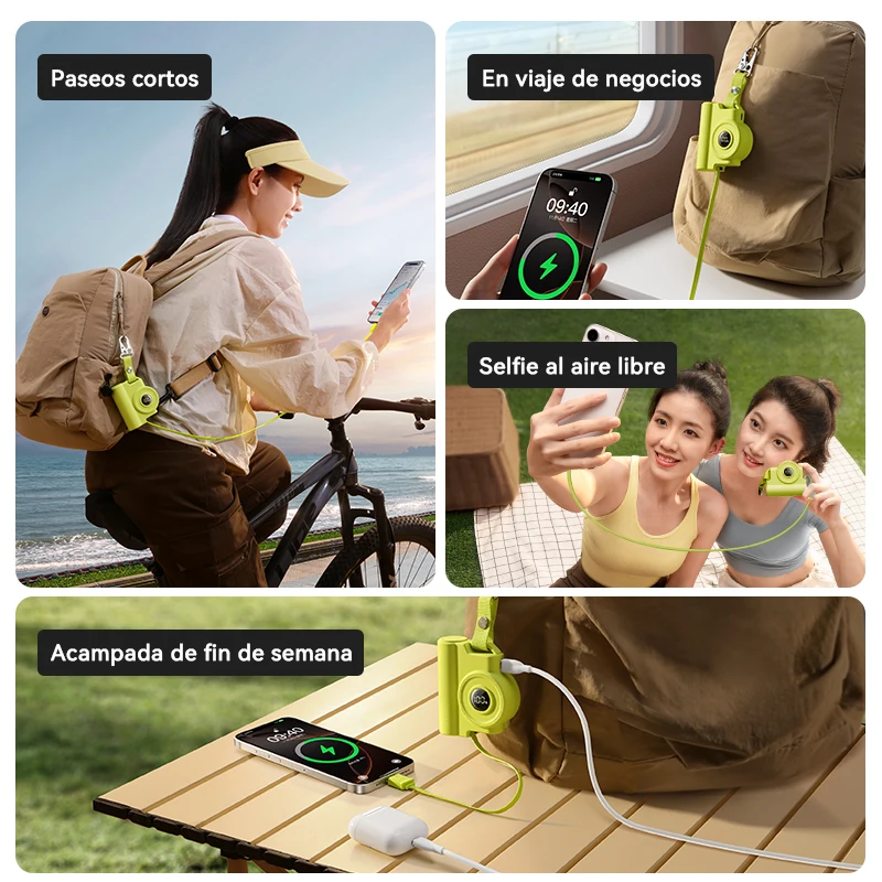 1.Viene con un cable retráctil, un tirón para cargar, tire de nuevo para rebotar y guárdelo dentro del banco de energía móvil