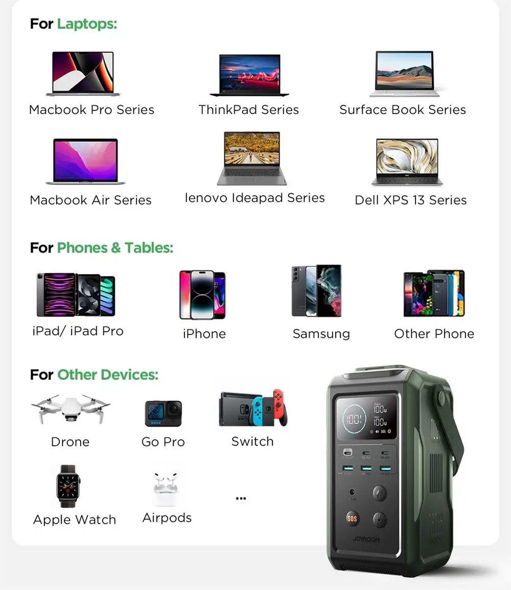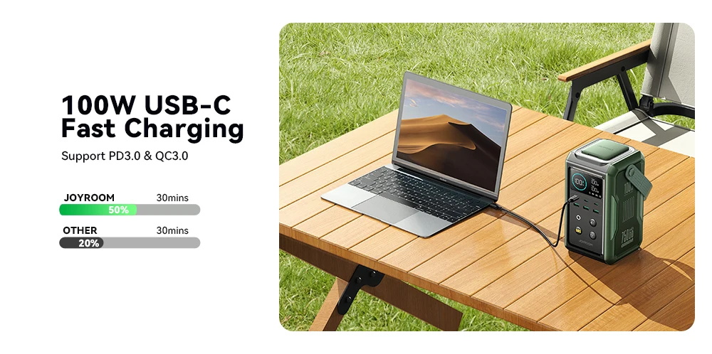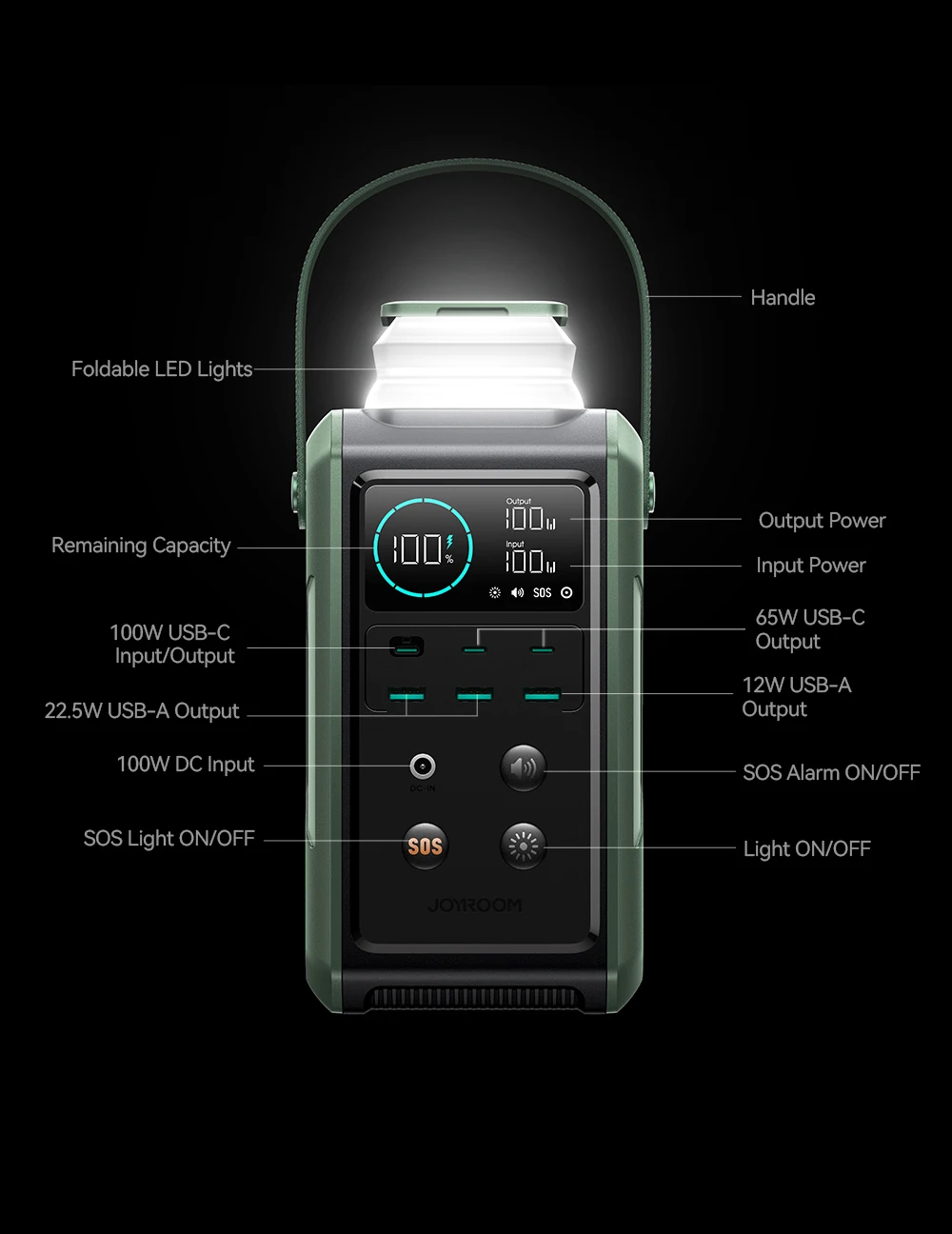 Q1: How to use the light?A: Click to light up the display screen, then click the button successively to switch color between white, warm yellow, red, blue, purple, colorful respectively.1. Lighting mode, five colors: White, Warm yellow, Red, Blue, and Purple.2. Colorful light AUTO mode, five colors: Red, Warm yellow, Green, Blue, and Purple .3. SOS Light mode: Only select lighting mode and any color of light. Hold down the SOS button for 2 seconds, and the light will flash. Hold down the button again for 2 seconds, the light will turn off .Q2: Does this power bank support PD/QC fast charging?A: Yes, lt supports PD or QC quick charging.Q3: Will the power bank still maintain a high-speed output of 100W when charging multiple devices simultaneously?A: Only USB-C1 output port works up to 100W. When multiple output ports work simultaneously, the USB-C1 output port will maintain 65W output continuously.Comprar JOYROOM 75000mAh 240Wh Estación de energía portátil con salida USB C de 100W Gran capacidad de batería Iluminación del banco de energía y modo SOS