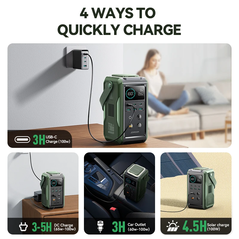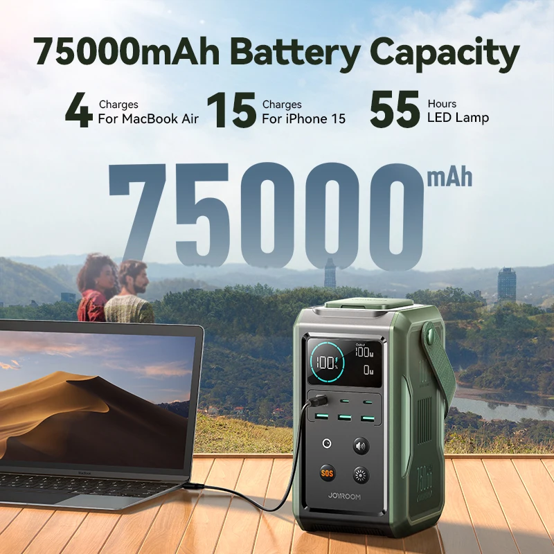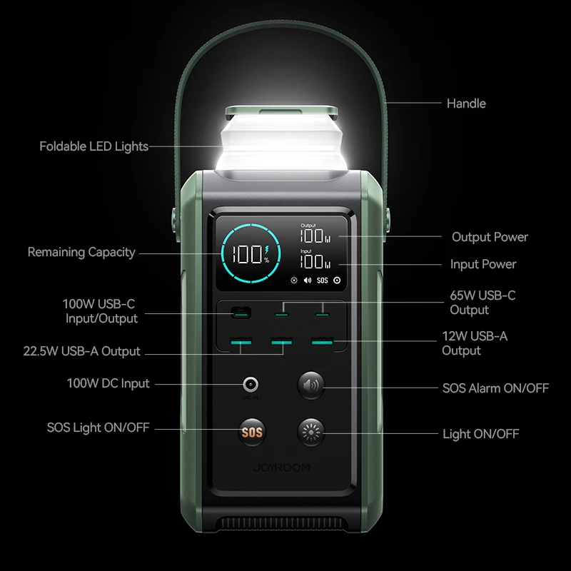 Q1: How to use the light?A: Click to light up the display screen, then click the button successively to switch color between white, warm yellow, red, blue, purple, colorful respectively.1. Lighting mode, five colors: White, Warm yellow, Red, Blue, and Purple.2. Colorful light AUTO mode, five colors: Red, Warm yellow, Green, Blue, and Purple .3. SOS Light mode: Only select lighting mode and any color of light. Hold down the SOS button for 2 seconds, and the light will flash. Hold down the button again for 2 seconds, the light will turn off .Q2: Does this power bank support PD/QC fast charging?A: Yes, lt supports PD or QC quick charging.Q3: Will the power bank still maintain a high-speed output of 100W when charging multiple devices simultaneously?A: Only USB-C1 output port works up to 100W. When multiple output ports work simultaneously, the USB-C1 output port will maintain 65W output continuously.Comprar JOYROOM 75000mAh 240Wh Estación de energía portátil con salida USB C de 100W Gran capacidad de batería Iluminación del banco de energía y modo SOS