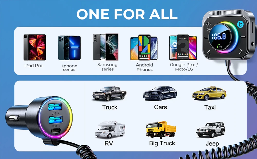 6.【Bluetooth 5,3】 Incorpora el último chip Bluetooth 5,3, que puede proporcionar un emparejamiento más rápido y una conexión más estable para música y llamadas ininterrumpidas. Con una potente función de memoria, este transmisor de radio Bluetooth para automóvil puede reconectarse automáticamente al último dispositivo usado cada vez que se suba a su automóvil y el audio se reanudará automáticamente donde se pausó.