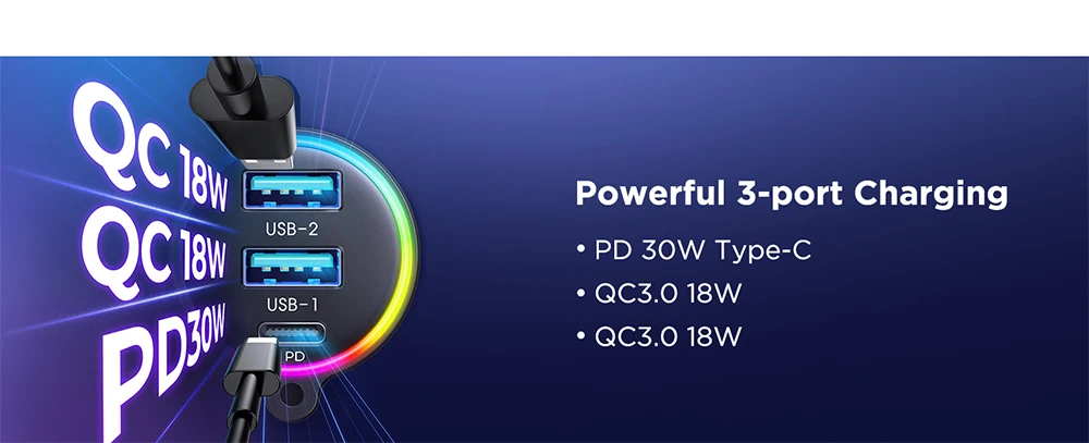 5.【Carga de tres puertos y diseño de luz LED】 El adaptador Bluetooth para coche puede cargar tres dispositivos simultáneamente a través de un PD 30W tipo C y dos puertos de carga USB QC3.0(18W por) y se asignará automáticamente la mejor eficiencia de carga. El Puerto PD es compatible con la serie iPhone/Samsung de carga rápida. El Puerto QC 3,0 puede cargar la mayoría de los dispositivos Android de 0% a 60% en 35 minutos. Cuando llega la noche, las luces LED pueden facilitarle la búsqueda del puerto de carga.