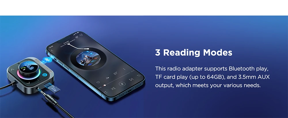 Este adaptador de radio admite reproducción Bluetooth, reproducción de tarjetas TF (hasta 64GB) y salida AUX de 3,5mm, que satisface sus diversas necesidades.