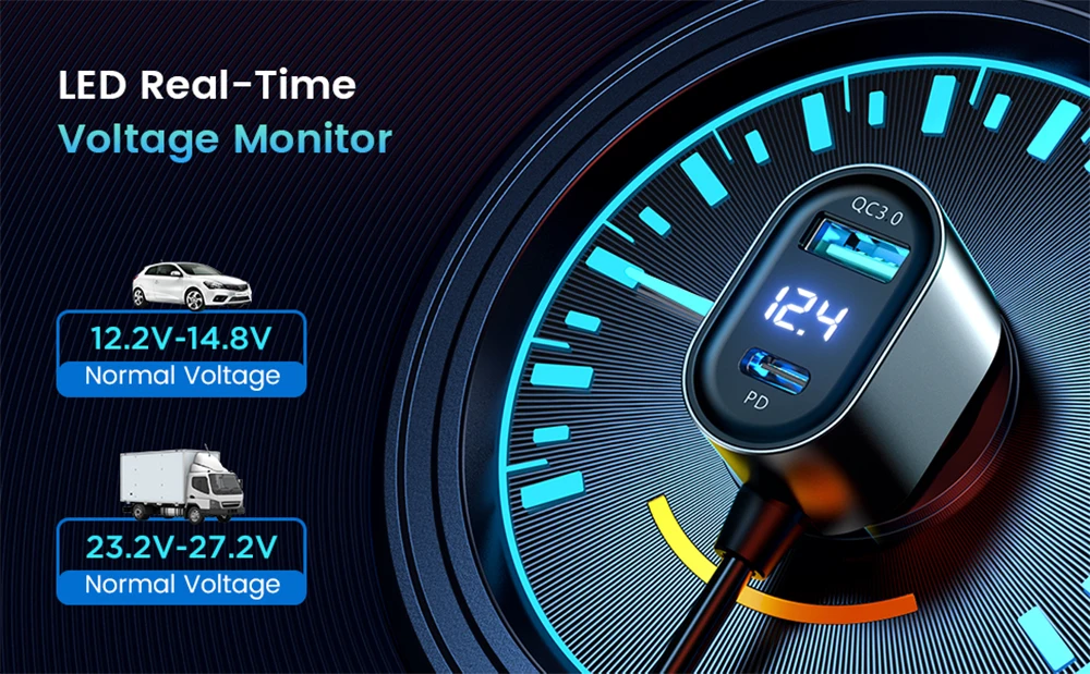 【Pantalla de voltaje LED】Cargador de coche JOYROOM USB C de carga rápida con la pantalla LED de voltaje en tiempo real que monitorea la salida de la batería del coche, la pantalla LED parpadeará para recordarle al conductor si el voltaje de la batería del automóvil es demasiado alto o demasiado bajo, le brinda una conducción segura [rango normal de voltaje de 12V: 11,5 V ~ 14,9 V; rango normal de voltaje de 24V: 23,1 V ~ 27,3 V