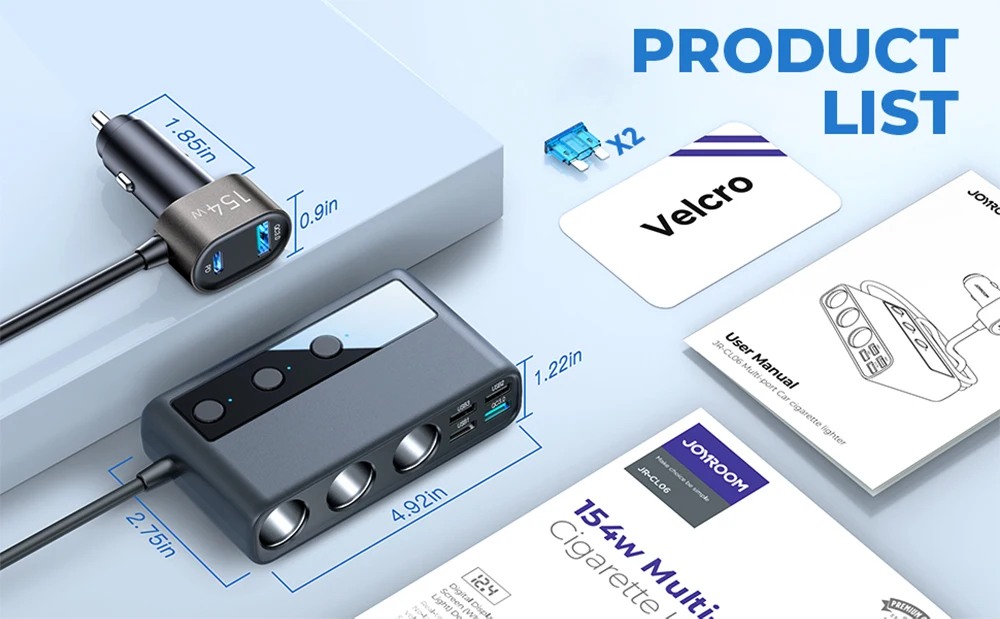 El divisor de encendedor de cigarrillos JOYROOM de 154W está certificado por instituciones de autoridad como UL, CE, FCC, RoHS, etc. Antes de la entrega, han sido probados por un equipo de inspección de calidad del producto de más de 400 personas para garantizar que tenga la mejor experiencia con el producto.