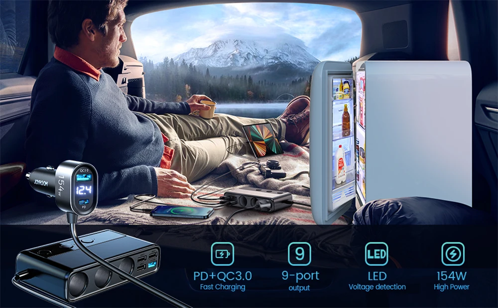 【 Adaptador de encendedor de cigarrillos 9 en 1 】Cargador USB JOYROOM para encendedor de cigarrillos equipado con 6 puertos de carga y 3 enchufes divisores de encendedor de cigarrillos, que proporcionan 154W en total. Adaptador de cargador de coche Carga rápida 9 dispositivos simultáneamente en sus vehículos de 12V/24V. El adaptador de cargador de coche USB C se adapta perfectamente a su GPS, cámara de salpicadero, aspiradora, nevera de coche, asientos con calefacción y navegación por satélite, etc. (La potencia de un solo enchufe no supera los 80W, admite la función de cigarrillo).