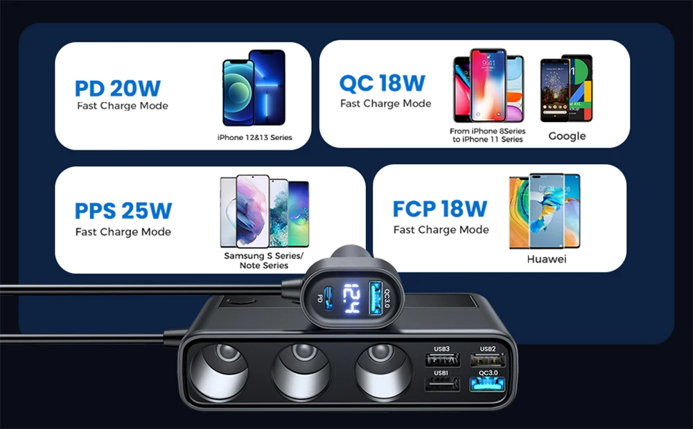 【Carga súper rápida QC3.0/PD】El cargador USB multipuerto para coche consta de 2 * QC 3,0 (18W + 18W) + 1 * PD(20W) + 3 * puertos USB (máximo total 18W). Los chips inteligentes incorporados del adaptador de cargador de coche USB C reconocen automáticamente la corriente de distribución para una carga rápida simultánea, compatible con iPhone, Samsung, Motorola, TCL, LG, Sony, etc.