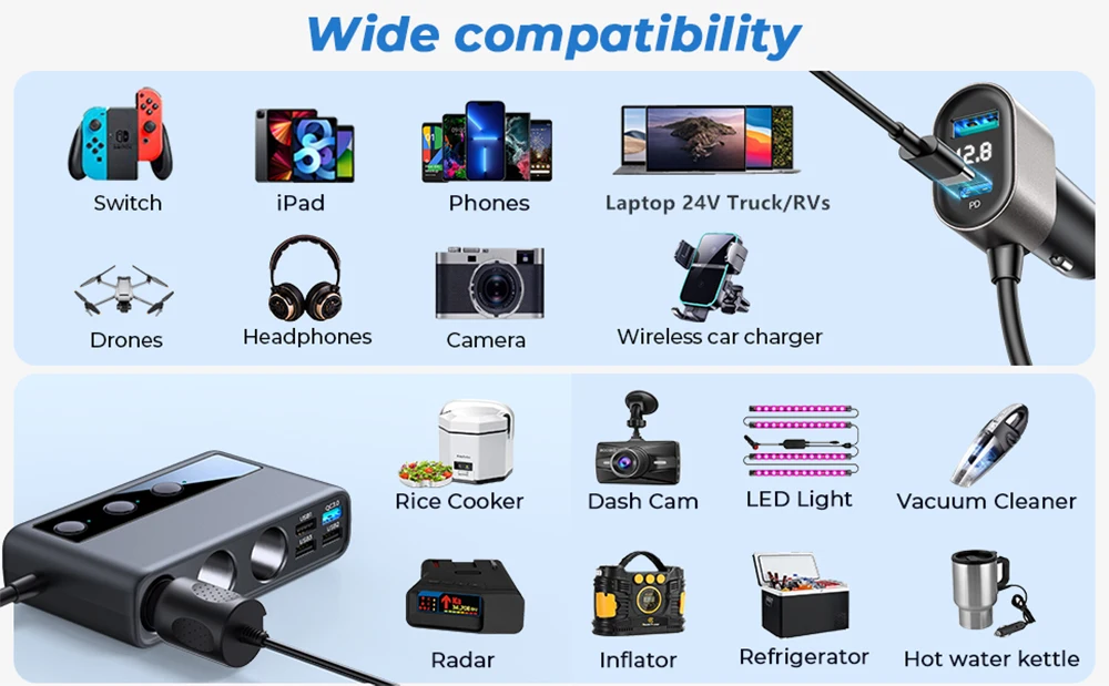 Teléfono, GPS, cámara de salpicadero, Dron, transmisor FM, refrigerador, luz LED, aspiradora, hervidor de agua caliente, olla arrocera, inflador, radar, etc.