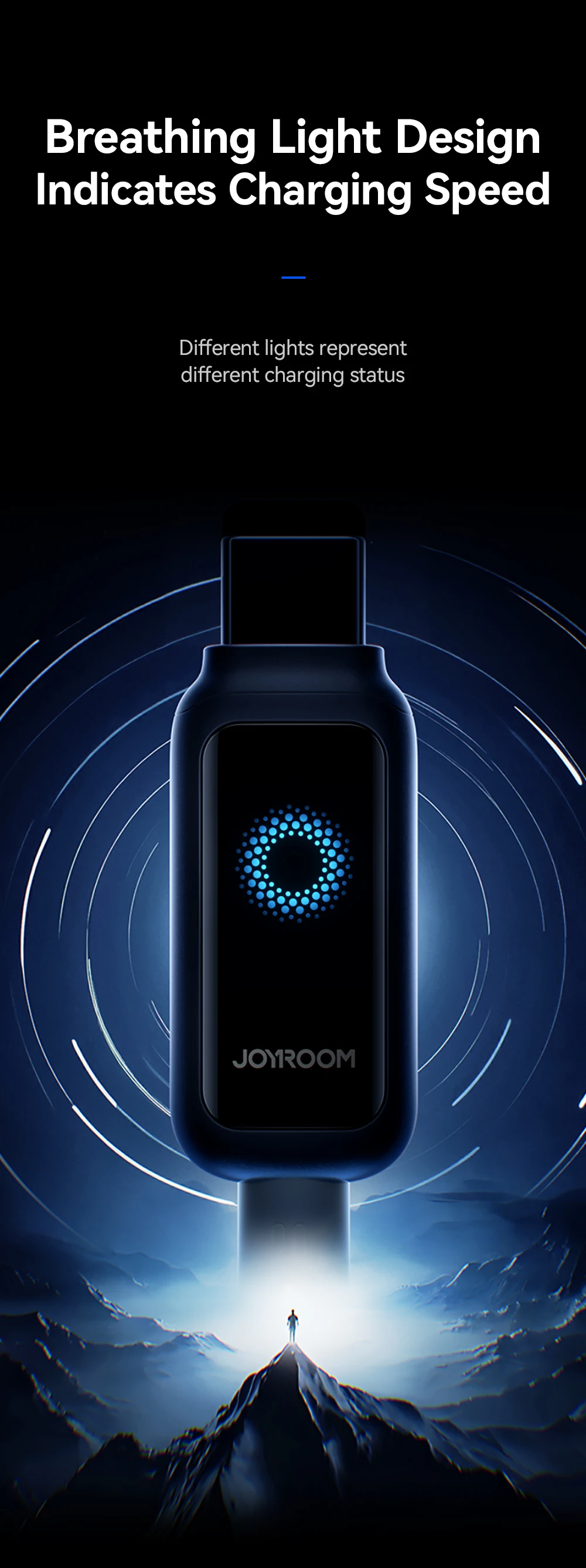 Luz de respiración naranja para una carga rápida; luz de respiración azul hielo para carga normal; luz azul hielo constante para carga lenta; y apagado de la luz cuando está completamente cargado.