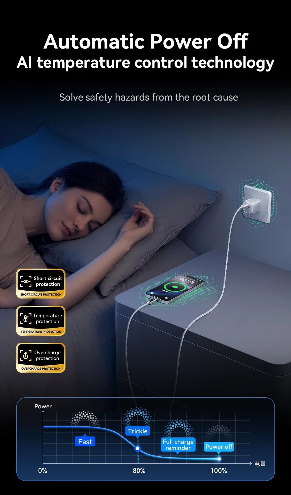 Se apaga automáticamente cuando está completamente cargado, protegiendo la batería de su teléfono y permitiendo una carga más segura por la noche.