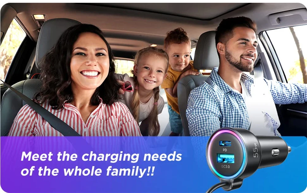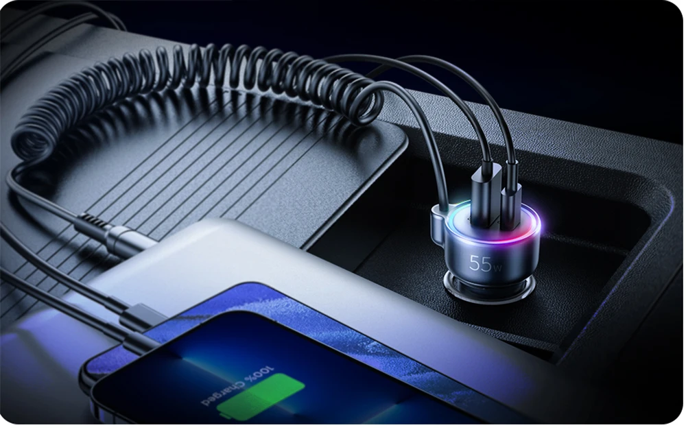 Universal 55W 3-port Car Charger Fast Charging with 5FT Coiled Cable