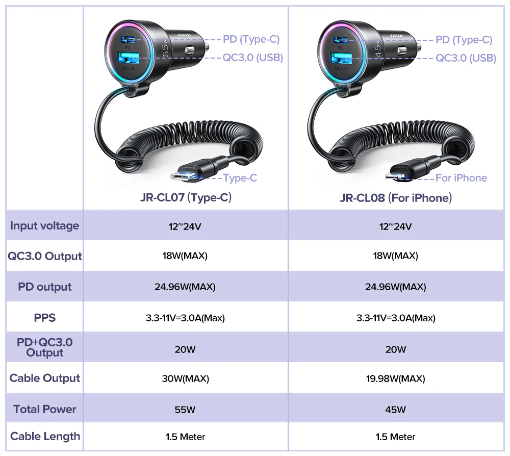 The fast car charger has a built-in soft multicolored ring LED light, which is convenient to find the interface and use at night. The color is rich and it adds a sense of atmosphere in the car