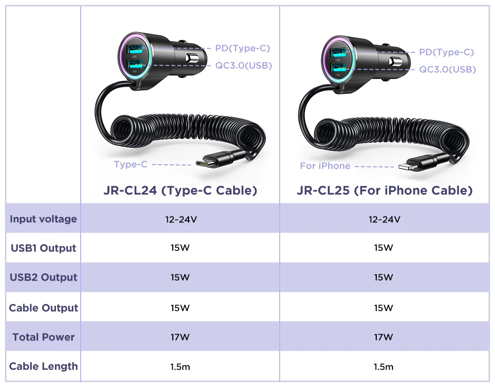 Type-C Coiled Cable Output: 5V⎓3A, 9V⎓3A,12V⎓2.5A,15V⎓2A, 20V⎓1.5A, (Max 30W)