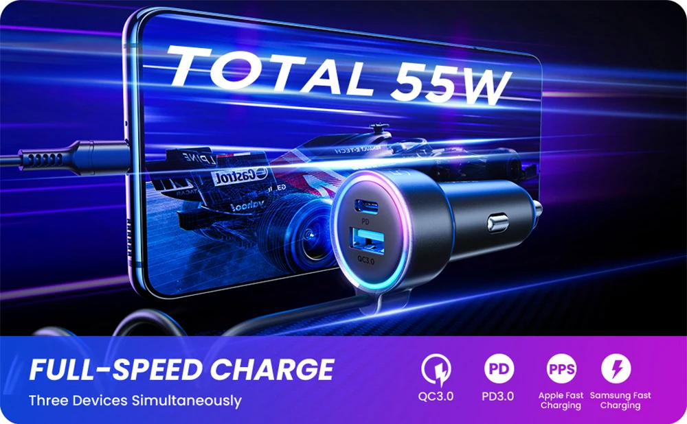 1. 【Multi-Device Fast Charging】55W fast car charger equipped with Type-C cable 30W SUPER FAST Charging output port, PPS PD25W, QC3.0 18W, support PD3.0/QC3.0/AFC and FCP super fast charging protocol. It can charge three devices simultaneously. Five times faster than 2.4A car charger