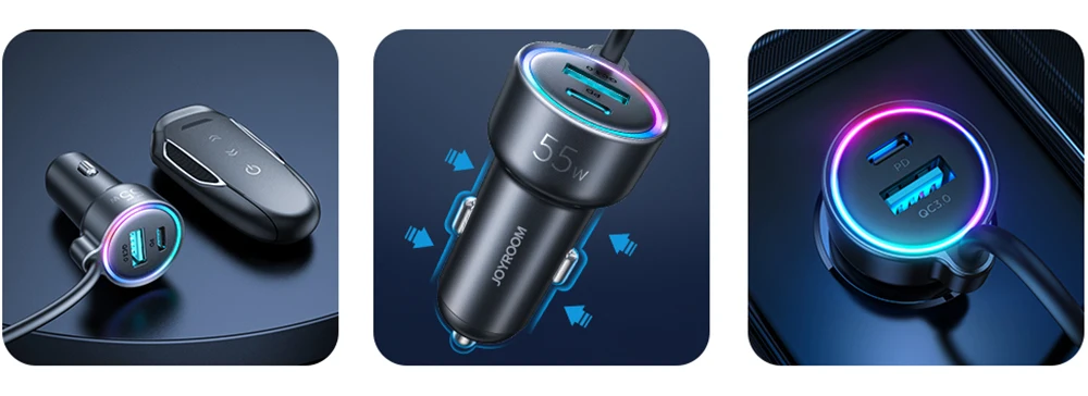 Comprar Joyroom-cargador de coche rápido USB C, 55W, 3 puertos rápidos, QC3.0 PD y, con Cable en espiral tipo C superrápido de 1,5 m y 30W