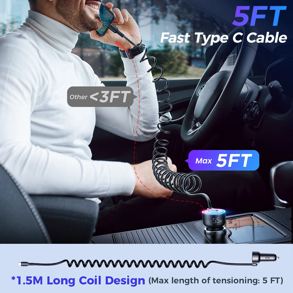 Universal 55W 3-port Car Charger Fast Charging with 5FT Coiled Cable
