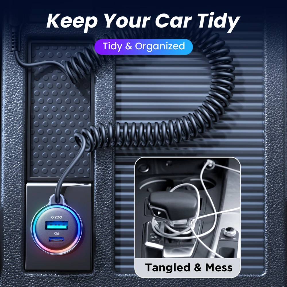 3. 【5FT Type C Coiled Cable & LED Light Design]】The cord is no longer entangled as it used to be, it is more convenient to use and store, and keep your car tidy. A long enough spring fast charging cable is also especially suitable for passengers in the back seat of the car. When night comes, LED lights can make it easier for you to find the charging port, and the lighting is also very beautiful and romantic