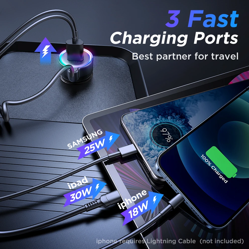 Joyroom USB C Car Charger, 55W 3-Fast Port Super Fast Car Charger PD& QC3.0 with 5ft 30W Super Fast Type C Coiled Cable, Car Charger for Samsung Galaxy S22/21/iPhone/Google Pixel/Moto/LG/Android, for iPad Pro