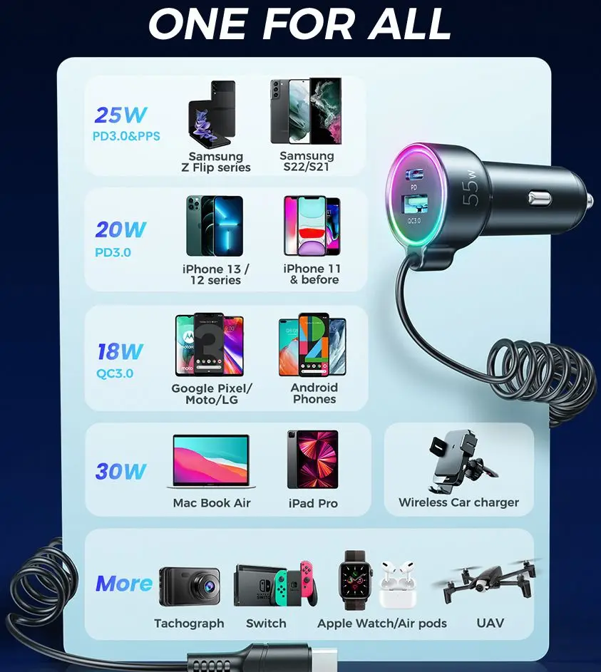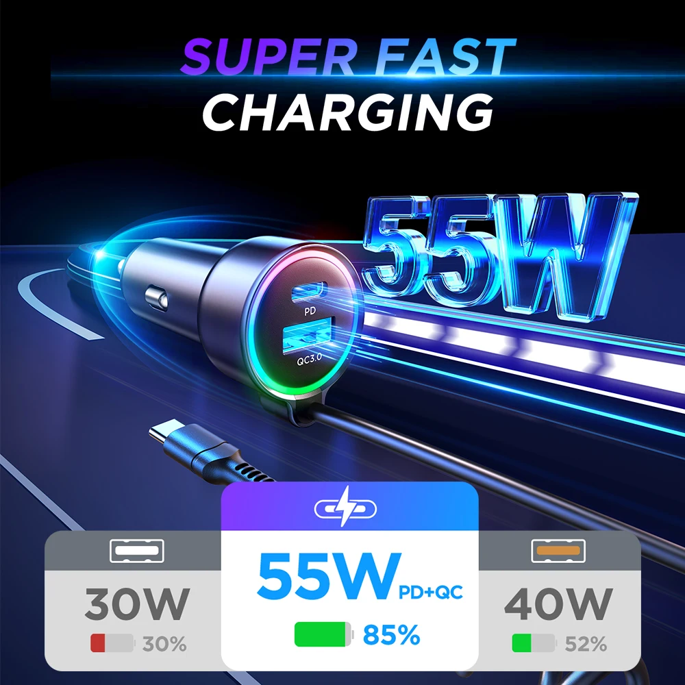 1. 【Multi-Device Fast Charging】55W fast car charger equipped with Type-C cable 30W SUPER FAST Charging output port, PPS PD25W, QC3.0 18W, support PD3.0/QC3.0/AFC and FCP super fast charging protocol. It can charge three devices simultaneously. Five times faster than 2.4A car charger