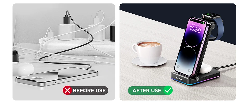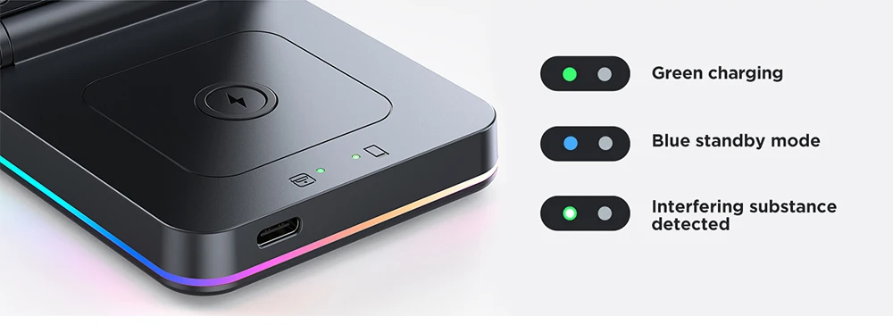 1.【Carga instantáne】El soporte del cargador inalámbrico Joyroom tiene bobinas duales integradas. En la inducción tradicional, debe tener un tipo de bobinas perfectamente combinadas. Deben estar muy cerca entre sí y tienen que estar en perfecta alineación. Pero con dos bobinas, no necesitas eso. Simplemente lanza nuestro teléfono en la almohadilla de carga para cargarlo al instante. Ya estés viendo una película horizontalmente o teniendo una videoconferencia verticalmente, tu teléfono puede alinearse fácilmente con la bobina y obtener una entrada de carga estable del cargador.