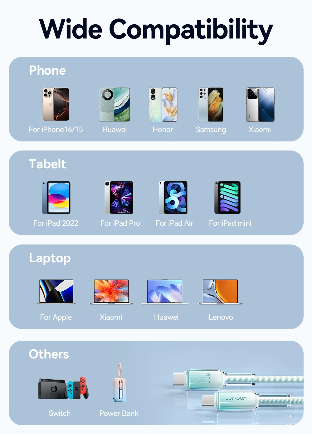 Universal Compatibility:Joyroom 60W USB-C to USB-C cable Compatible with ALL USB-C Devices PHONE LAPTOP CAMERA. Not only for iPhone 16/15 series,compatible with Samsung Galaxy S23 S23+ S23 Ultra S22 S22+ S22 Ultra S21/ S21+/ S21 Ultra S20/ S20+/ S20 Ultra Note 20/ Note 20 Ultra Note 10/ Note 10 Plus A90 A80 A72 A71 A70. Compatible with Pixel 2/2XL/3/3XL/3a/3aXL/4/4 XL/ 5/6/6a/7 (View Product Description for details).