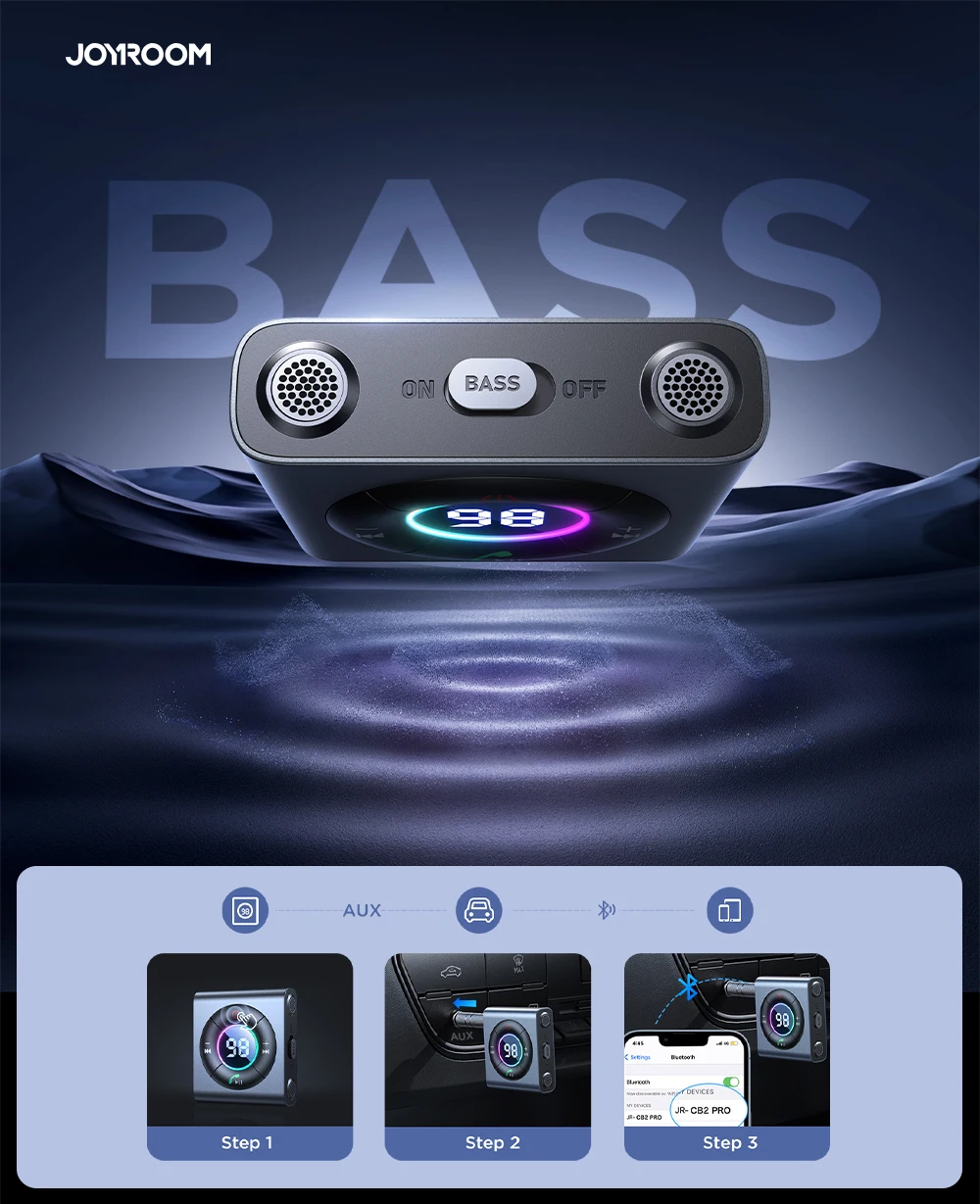 【Estéreo de alta fidelidad y potenciado bajo】El adaptador de coche JOYROOM aux Bluetooth Simplemente deslice el botón 'BASS' para disfrutar de potentes graves profundos y sonido estéreo envolvente. Al mismo tiempo, también utiliza tecnología HiFi de alta calidad para restaurar el sonido real y los graves potentes, proporcionando la mejor experiencia auditiva.