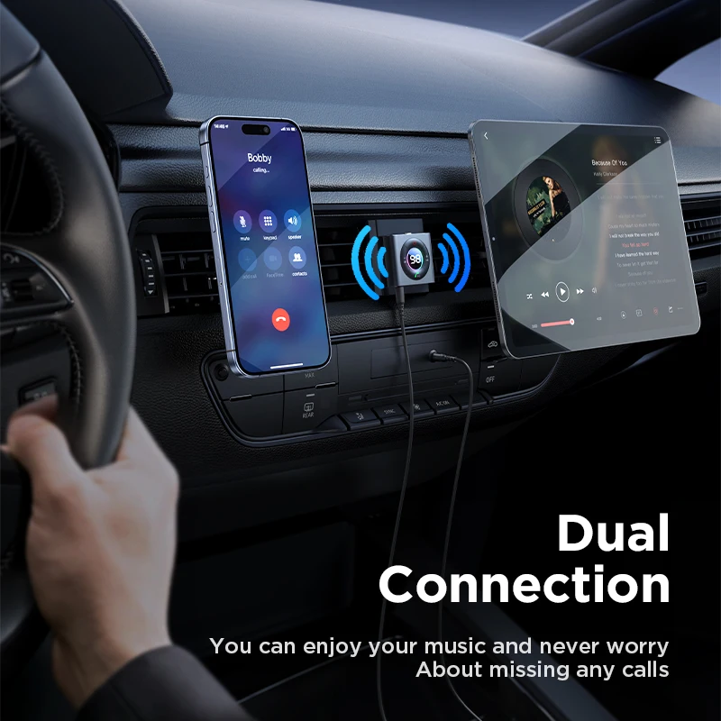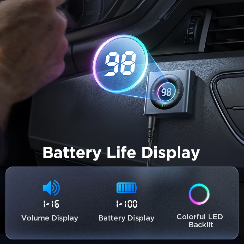 2023 actualización Bluetooth 5,3 AUX adaptador de coche [micrófonos duales y sonido de graves profundos HiFi] [Cancelación de ruido y pantalla de duración de la batería] receptor Bluetooth JOYROOM para música de coche/llamadas manos libres, duración de la batería 26H