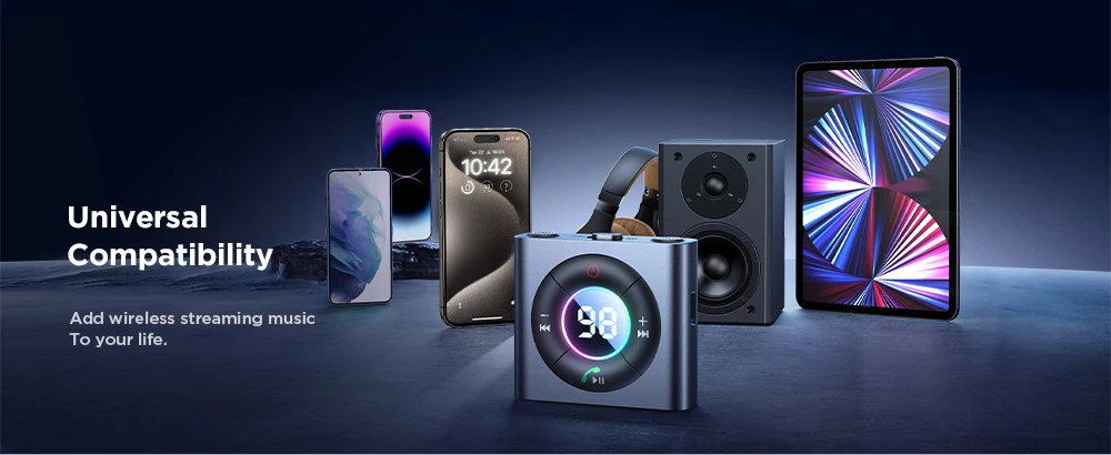 【Pantalla digital LED innovadora】Otra característica única de este adaptador estéreo Bluetooth portátil es su pantalla LED. En él, podemos conocer el estado actual de varias funciones, como los niveles de volumen y la cantidad exacta de potencia. Puede recordarnos que debemos cargar a tiempo para que podamos reproducir música sin interrupciones.