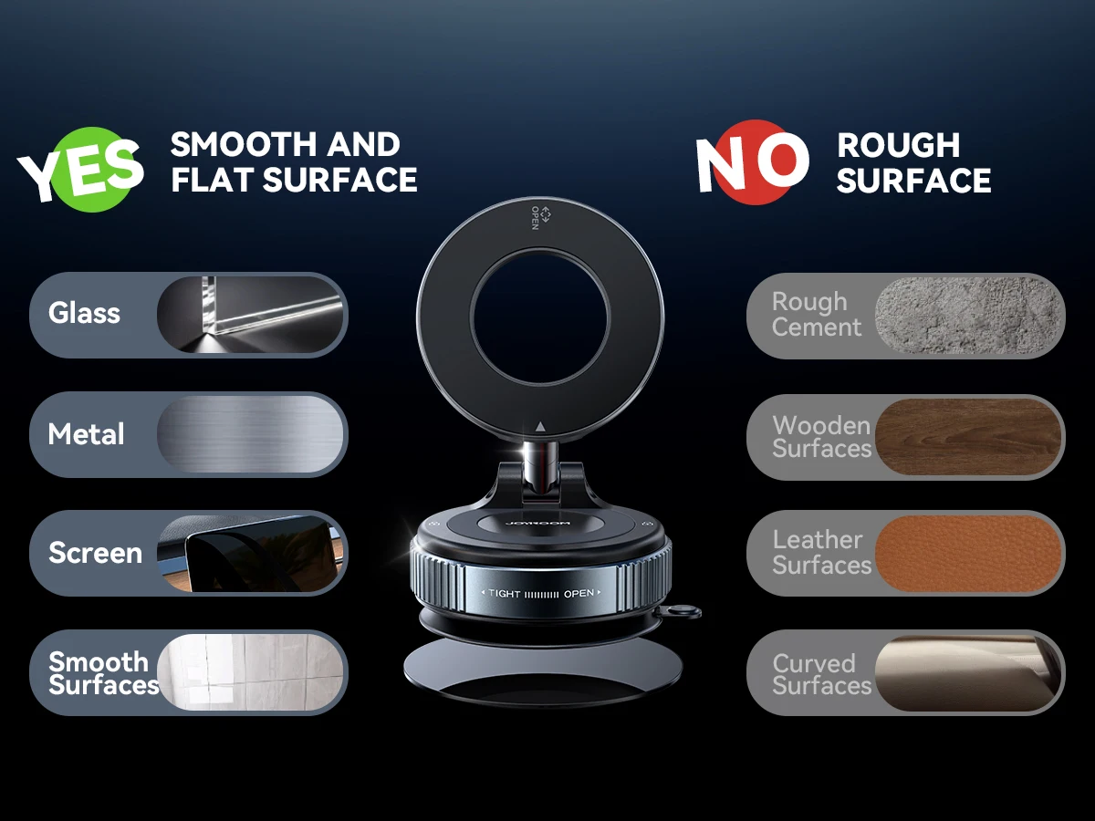 1.【Innovative Suction Cup Base with Unmatched Stability】Joyroom's upgraded suction cup phone mount creates a vacuum seal that grips firmly on windshields, dashboards, or any smooth surface - even in extreme temperatures.It stays rock-solid through bumpy roads yet removes cleanly without residue.(Includes a free dashboard pad specifically designed for textured surfaces - simply attach your suction cup phone mount to this adhesive platform for rock-solid positioning on grainy dashboards).