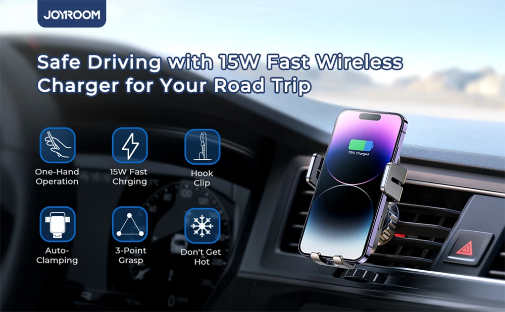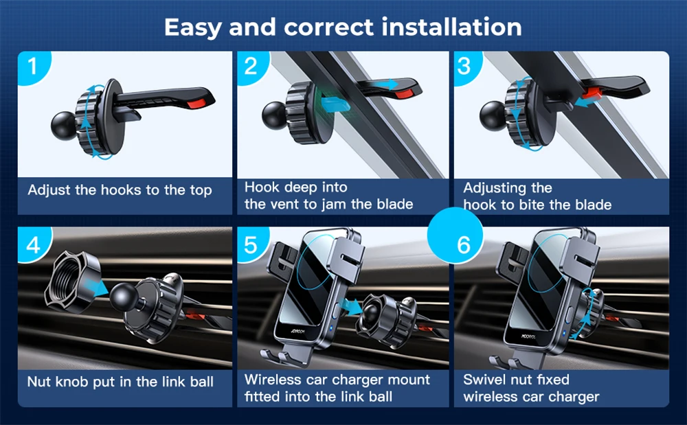 5【 Diseño 2 en 1 】Combina el cargador de teléfono inalámbrico y el soporte de teléfono para coche, lo que permite una experiencia de manos libres segura. Manténgalo alejado de los cables o cables de localización enredados. El soporte de teléfono Joyroom para coche monta el cargador es adecuado para la instalación de parabrisas, salpicadero y ventilación de aire, y hace que el GPS y las llamadas telefónicas sean más convenientes.