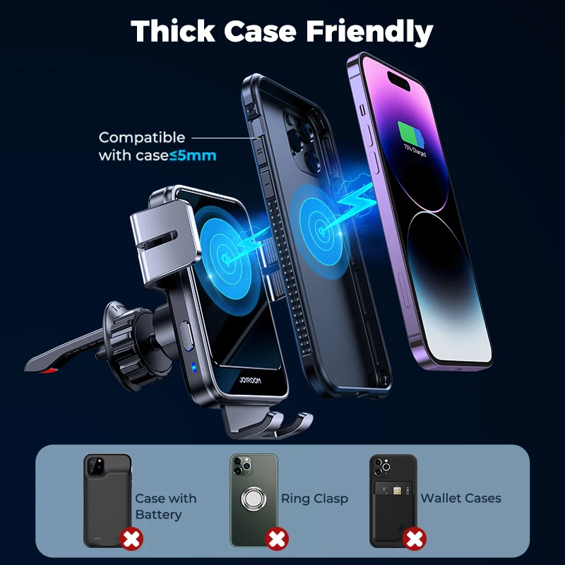 4【Ángulo flexible y fácil de usar】Con un soporte retráctil y plegable y cabeza giratoria de 360 °, nunca bloquea la vista de conducción, puede ajustarlo a una posición que lo hace cómodo. El cargador inalámbrico para coche Joyroom admite la carga a través de carcasas de teléfono de hasta 5mm de grosor. Tenga en cuenta que las carcasas hechas de metal, los accesorios externos como imanes, tarjetas de crédito, agarres y soportes interferirán con la carga.