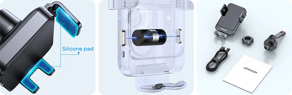3【Base superestable 】El soporte de teléfono Joyroom para la base del cargador inalámbrico del coche está equipado con una potente ventosa y un adhesivo profesional 3M (resistente a altas temperaturas). La ventosa de la base se ha probado miles de veces, puede absorber más de 20 libras de objetos sin caerse. Incluso si pasa golpes de velocidad o conduce por carreteras de montaña, no tienes que preocuparte de que se caiga. Además, el brazo del soporte y el clip están equipados con almohadillas de silicona antideslizantes y antivibración.
