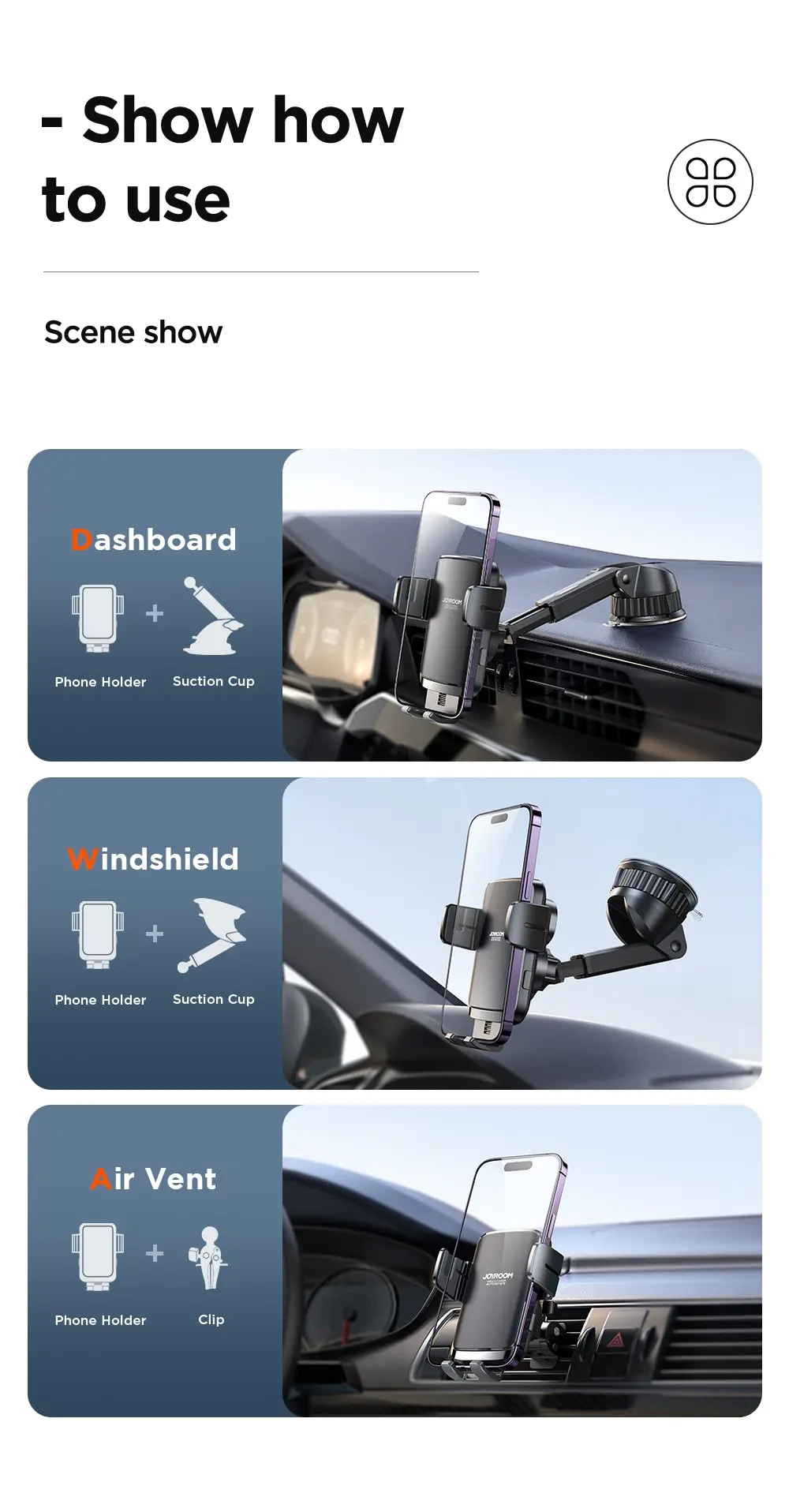 【Ventosa fuerte y visualización ajustable】 --Tiene varias instalaciones del soporte del cargador de coche inalámbrico, se puede instalar en el parabrisas, salpicadero, mesa de forma segura con la fuerte ventosa