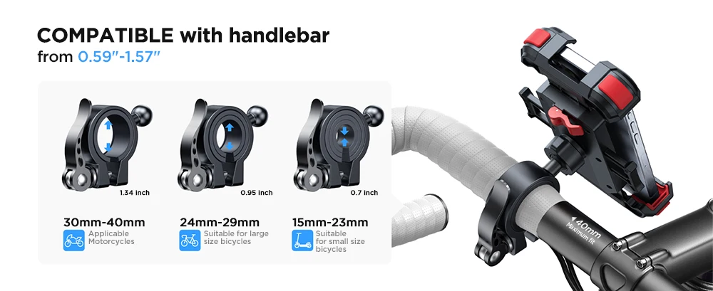 6. Diámetro del manillar compatible Φ 15-40mm;