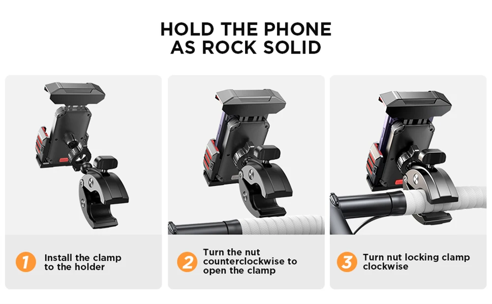 2.[Increíblemente resistente]-Para abordar el problema de los clips del manillar que se rompen fácilmente y causan daños en el teléfono, nos centramos en mejorar la barra de acero inoxidable de la abrazadera del teléfono del manillar para que sea más compatible, goma antideslizante sólida mejorada del soporte para teléfono de bicicleta para mejorar el agarre, y el soporte para teléfono de bicicleta nunca se caerá ni se balanceará durante la conducción, Lograr la máxima estabilidad y seguridad se puede lograr en descensos rápidos y carreteras con baches.