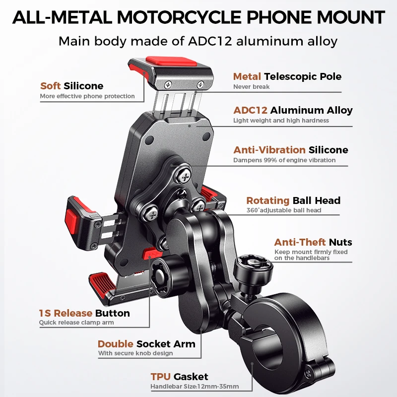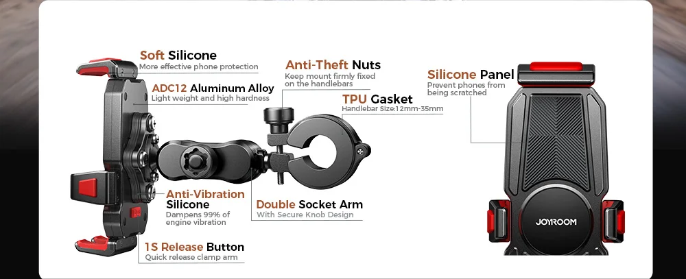 JOYROOM Soporte para teléfono de motocicleta de aleación de aluminio, soporte metálico para teléfono de motocicleta con amortiguador de vibraciones, para motocicleta, bicicleta, scooter, ATV/UTV, Compatible con iPhone, Samsung y todos los teléfonos móviles