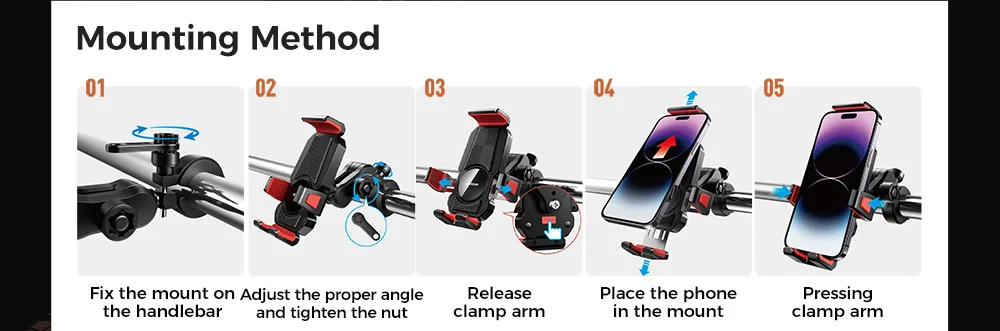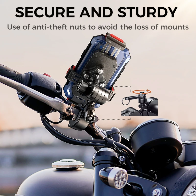 5.[ Nueces antirrobo ]Las tuercas de ajuste de nuestro soporte para teléfono para bicicleta solo se pueden ajustar con la llave original equipada de fábrica, evitando robos y garantizando que su teléfono se mantenga seguro.