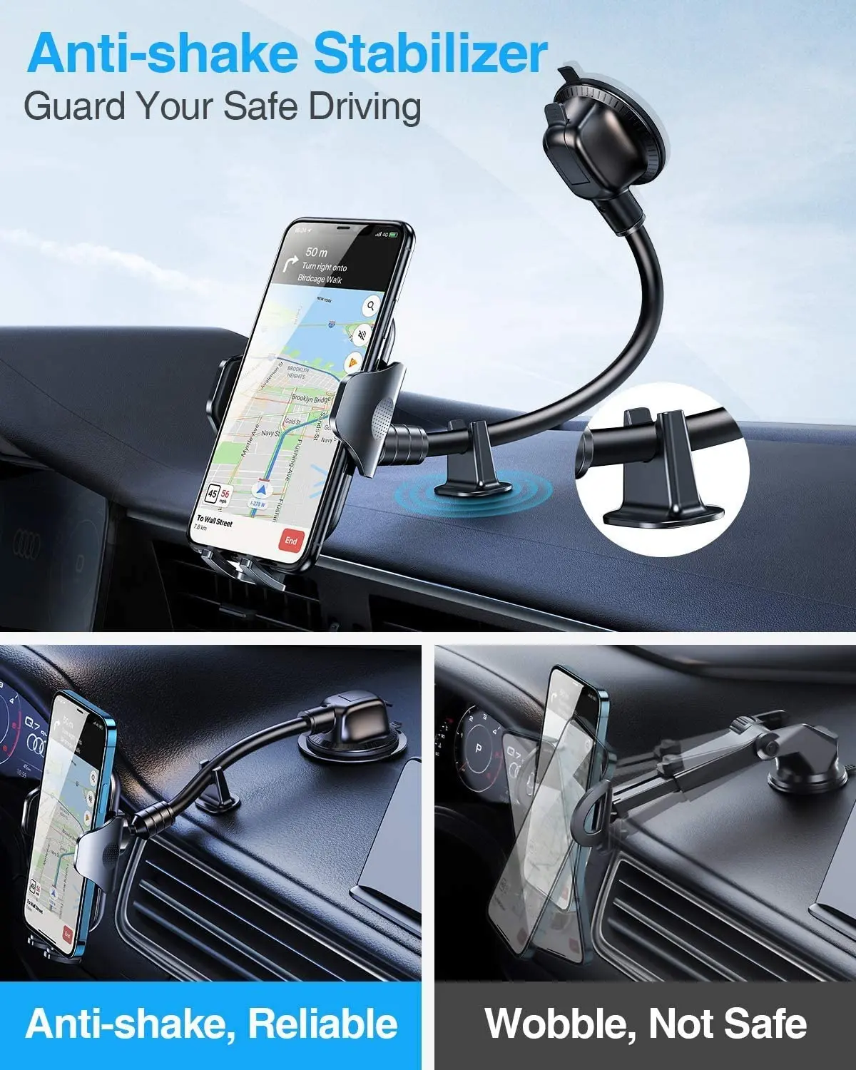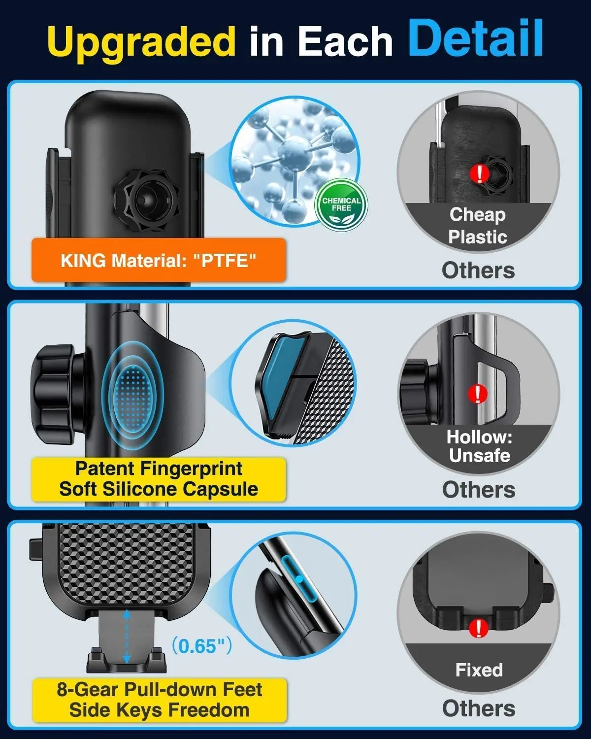 1. Diseño ergonómico-liberación rápida. ----- Solo se tarda unos segundos en instalar o quitar el teléfono fácilmente. Simplemente haz clic en el botón de la izquierda y tu teléfono será liberado del soporte.