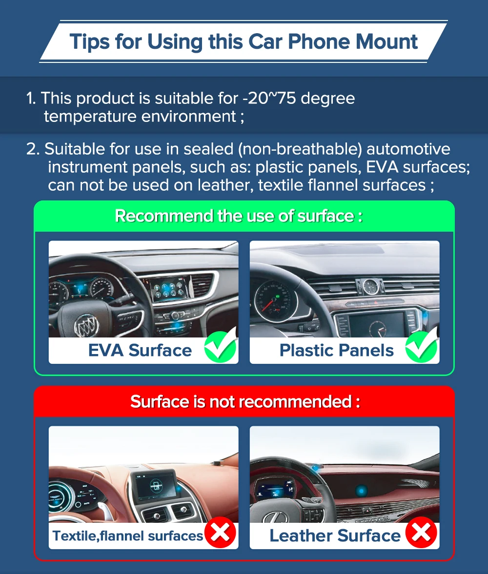 2. Adecuado para usar en paneles de instrumentos automotrices sellados (no transpirables), como: paneles de plástico, superficies EVA; No se puede utilizar en cuero, superficies de franela textil;
