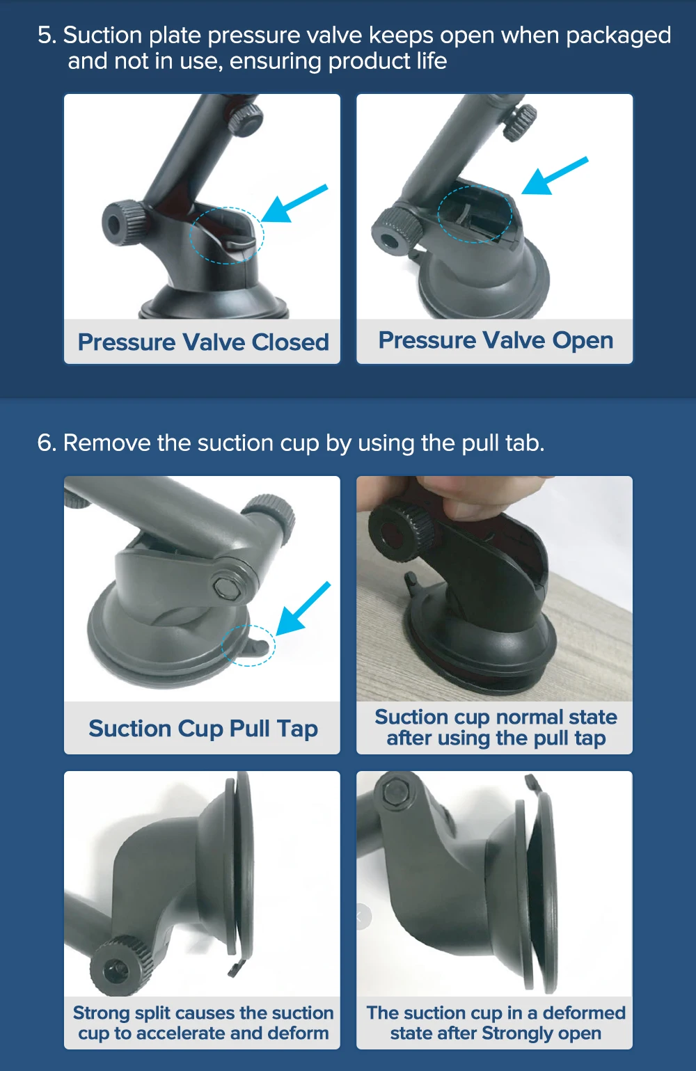 Nota: después de pegar la ventosa al salpicadero, debes esperar al menos diez horas y luego usarla, de lo contrario la ventosa no se puede pegar firmemente.