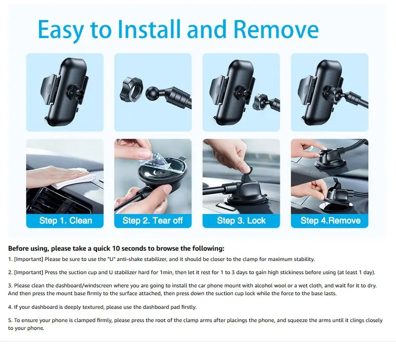 3. Limpie el salpicadero/parabrisas donde va a instalar el soporte del teléfono del coche con lana con alcohol o un paño húmedo, y espere a que se seque. Y luego presione la base de montaje firmemente a la superficie adjunta, luego presione el bloqueo de la ventosa mientras dura la fuerza a la base.